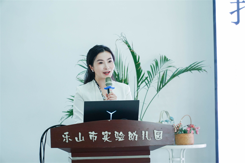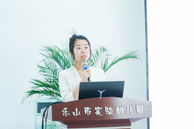 接下来,乐山市实验幼儿园久顺分园教科室主任凌静思以《九十六个故事的光芒:一所幼儿园的原创绘本生长记》为题,讲述了久顺园在集团“3S”思想母体的指引下与市图书馆资源融合,打造阅享”课程,深情讲述了九十六个故事背后的成长密码,并提出了我们关于出版的困惑与迷思。