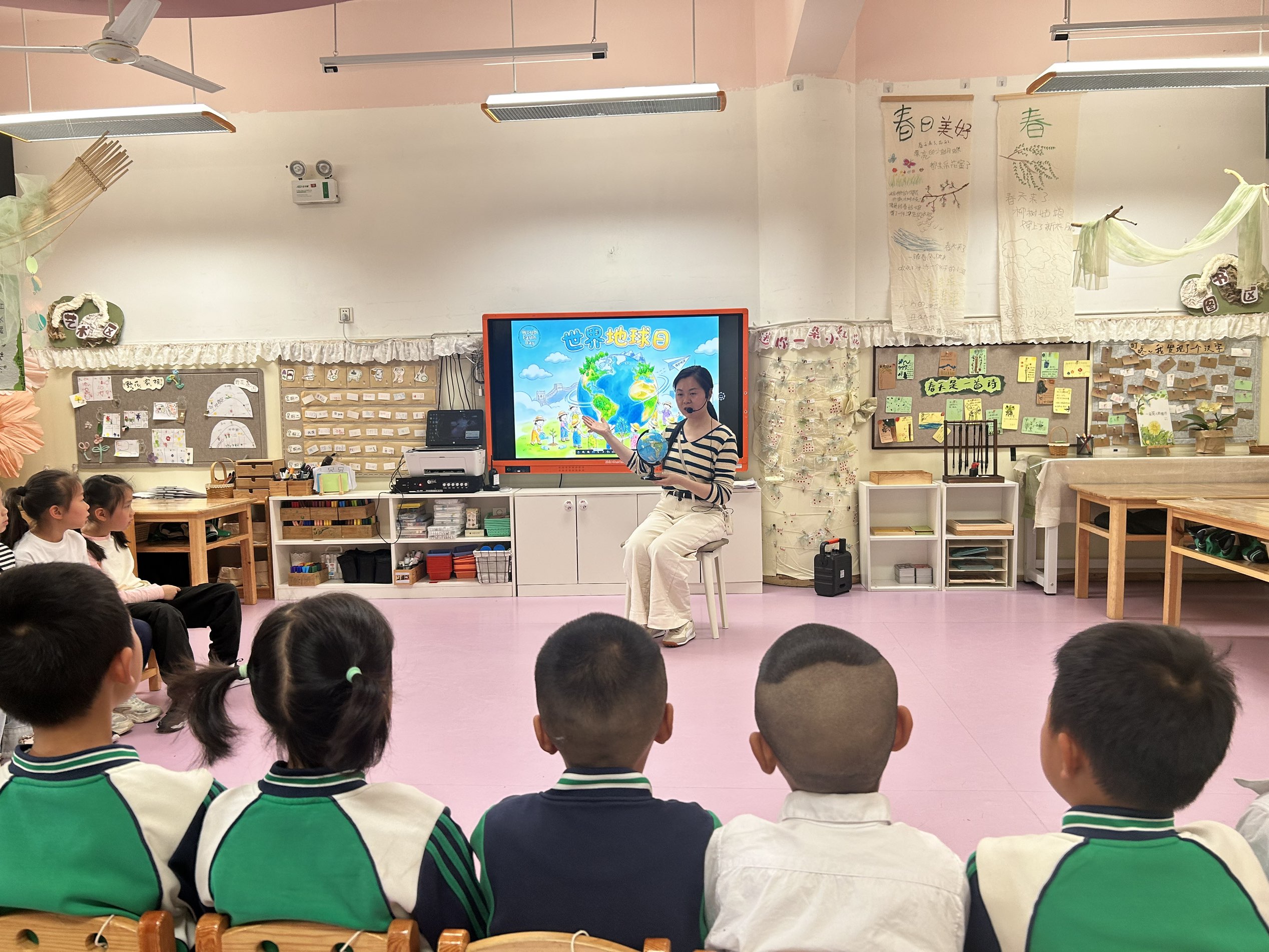 在校园里,开启一场温暖的地球守护之旅。 一圈小小的地球仪,藏着大大的世界。老师带领孩子们围坐在一起,轻轻转动地球仪,用浅显易懂的话语,和宝贝们一起认识:• 蓝色的是广阔海洋• 绿色的是茂密森林• 黄色的是宽广陆地孩子们满眼好奇,在直观观察中慢慢懂得:我们和花草、小鸟、小动物,一起生活在这颗蓝色的星球上。整洁美好的家园,需要我们用心去爱护。