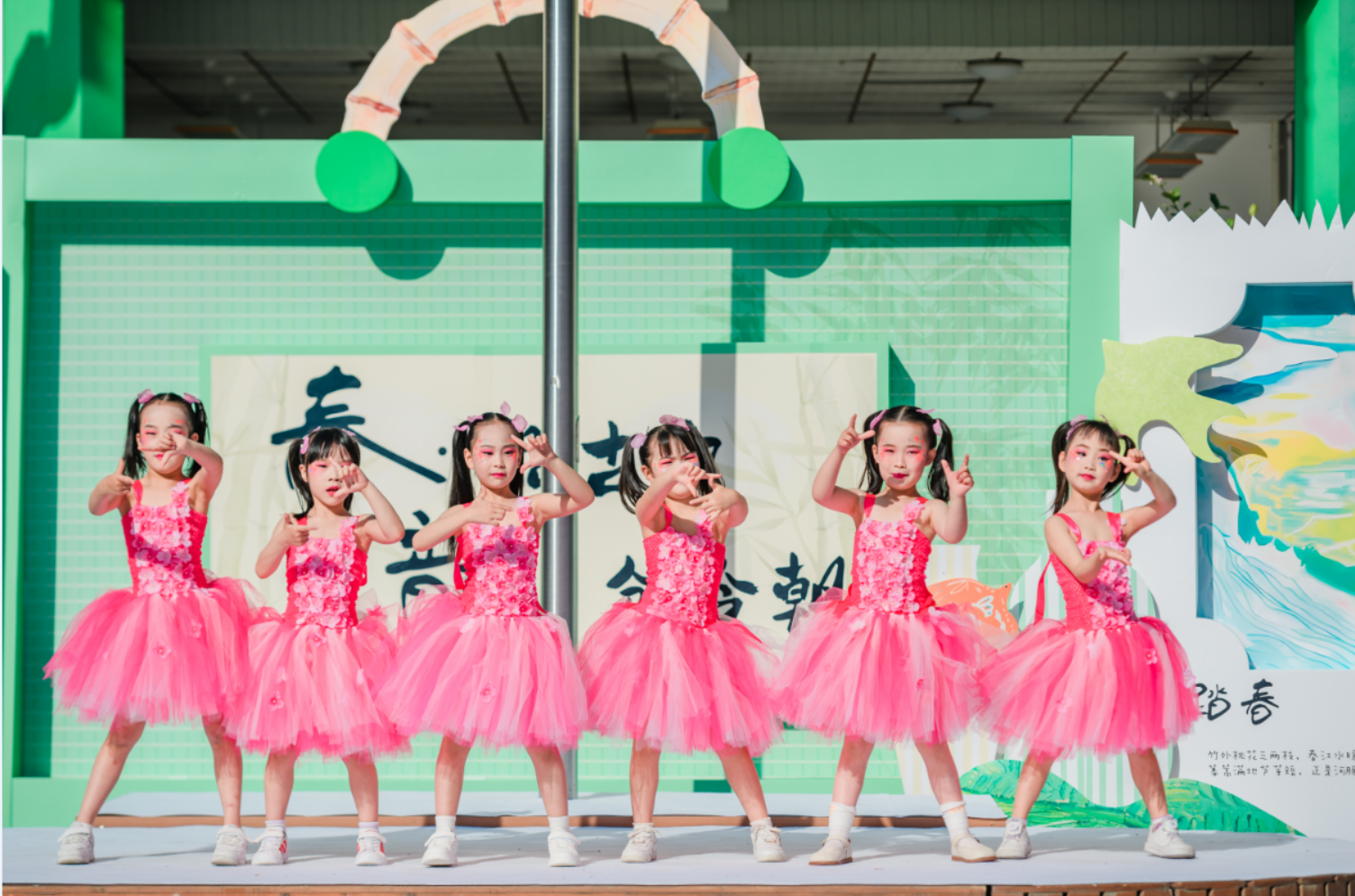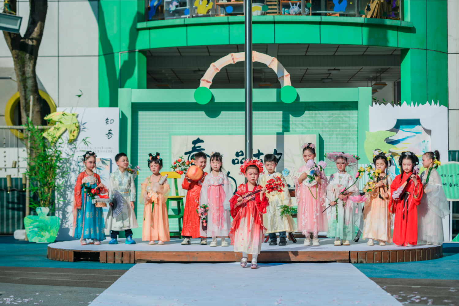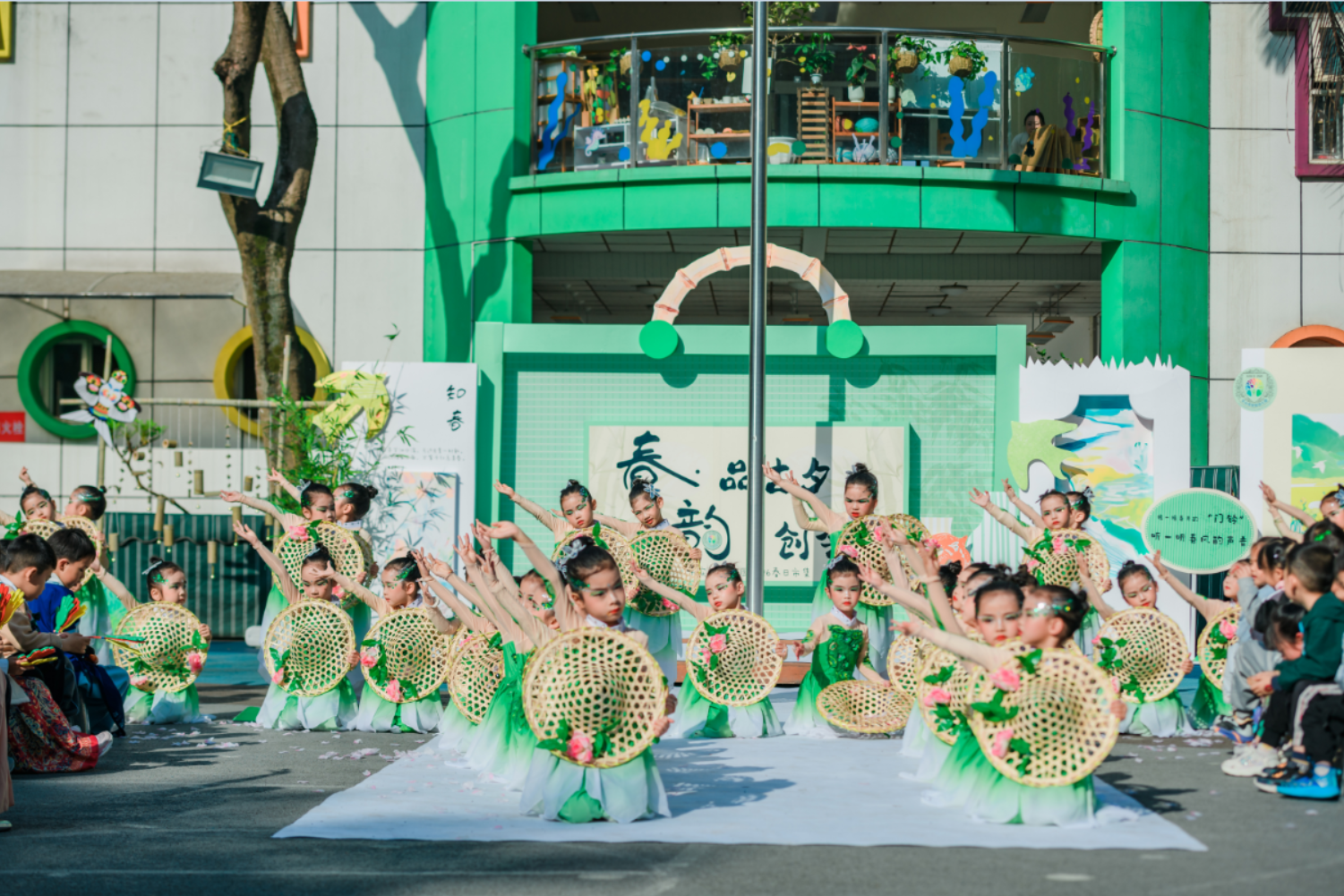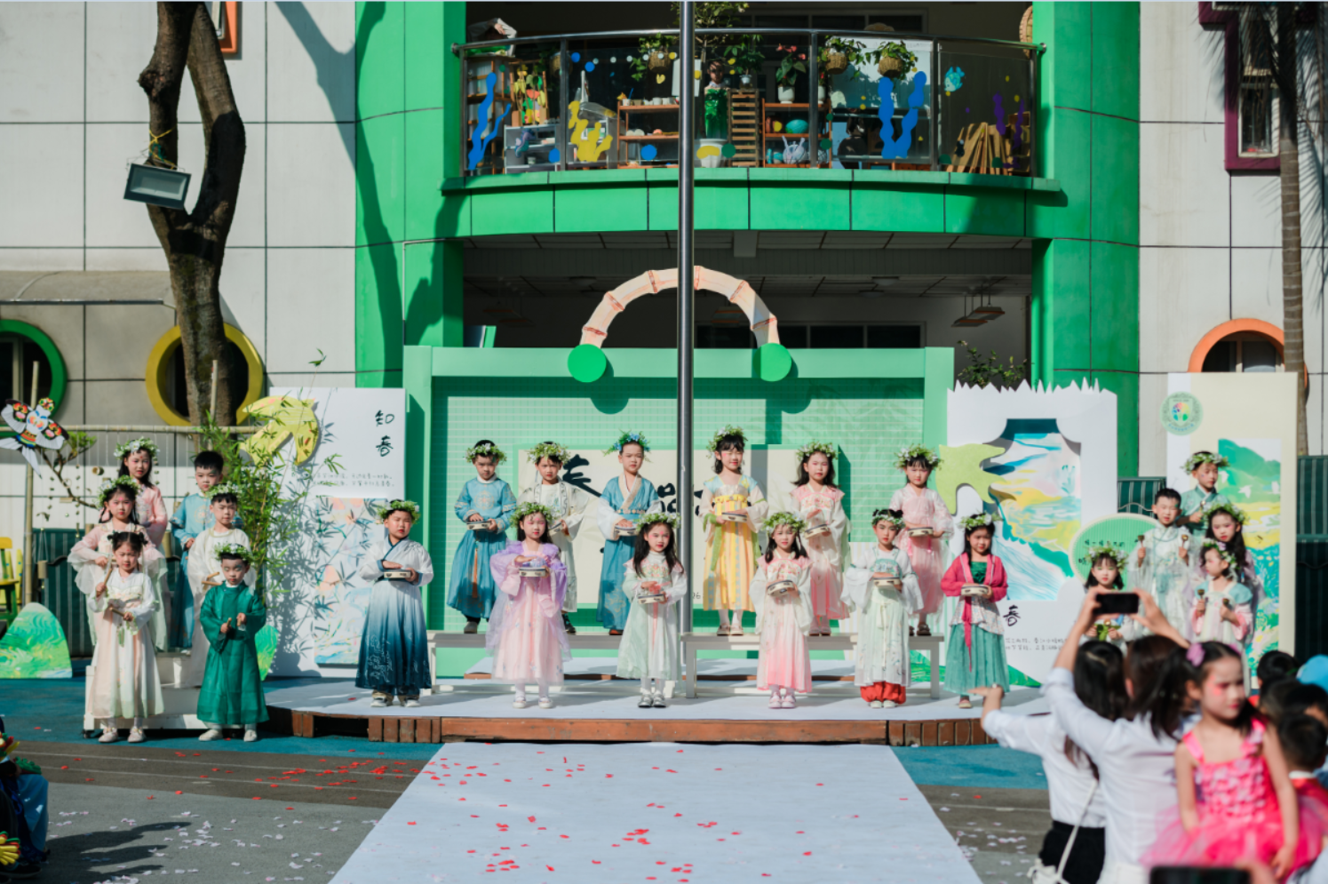 活动伊始,一场精彩的开集仪式拉开了春日市集的帷幕。签到环节别出心裁,十二花神NPC互动、敲响春天等趣味环节,让孩子们一入园便沉浸在春日的欢乐氛围中。开集仪式上,中班舞蹈《立春》灵动展现春日生机,情景剧《诗中游》十二花神带领师幼在诗词中邂逅春日美好,大班舞蹈《香水百合》绽放童年烂漫,全园大合唱《春声和鸣——春日串烧歌曲》将氛围推向高潮,悠扬的歌声与欢快的乐器声交织,满是春日的美好。