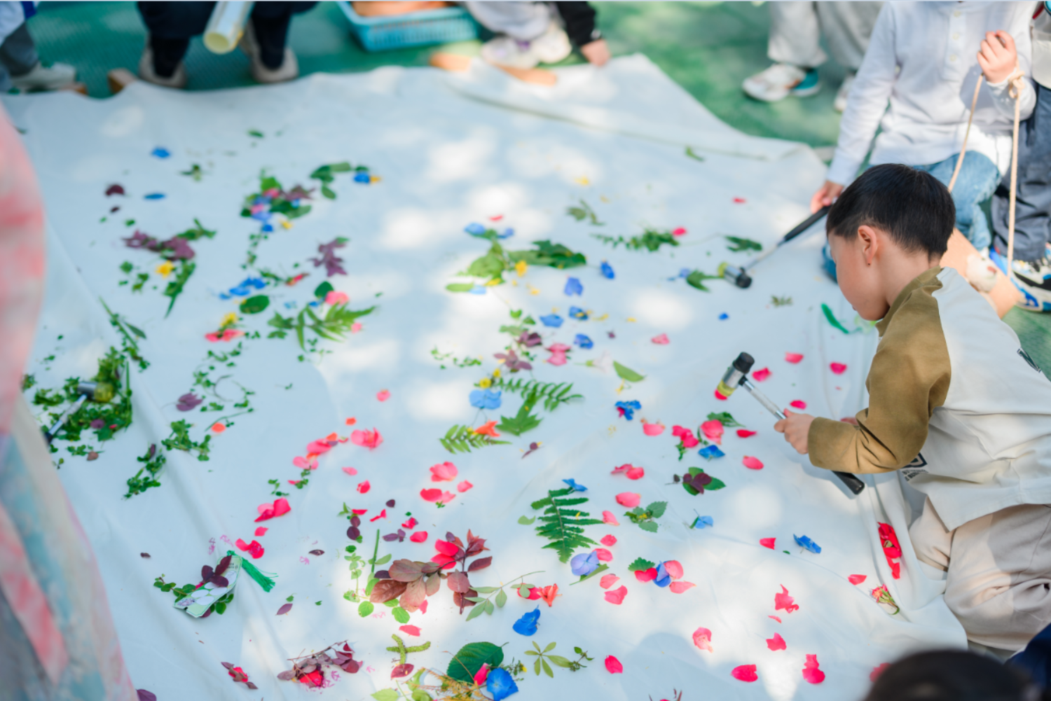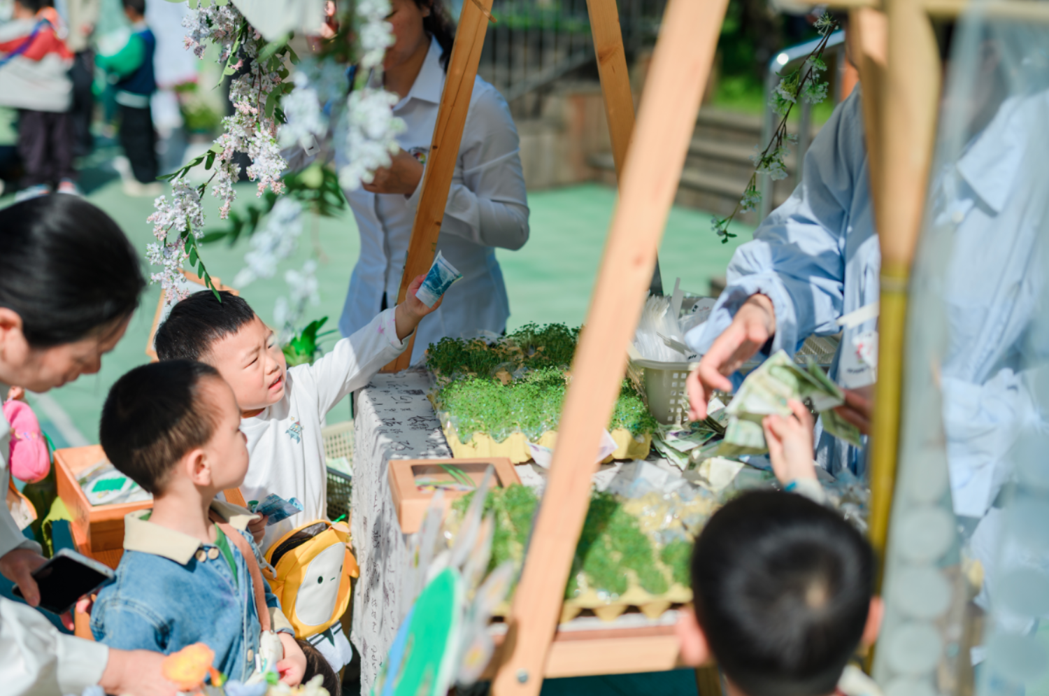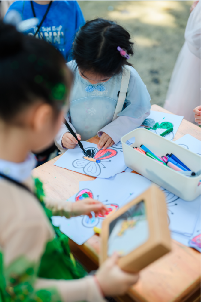 市集畅游环节中孩子们个个佩戴着自制“十二花神卡”,兴高采烈地穿梭在各个摊位之间,开启了趣味满满的春日市集之旅。本次市集以“文创买卖+游戏体验”为核心,孩子们在逛市集中还能集齐十二花神的贴纸。与“春”互动的一个月中各班结合春季课程、班本游戏及园所文化,打造了各具特色的摊位,将“春韵”传统与童趣创意完美融合。啾啾树林里,孩子们认真聆听风的声音,感受诗词中的春日意境;繁花绽放的桃树下,孩子们手持小勺,运送春日的种子回家;小山坡旁,孩子们在画布上绘制春日美景;银杏树下,孩子们打造专属春日小物件……幼儿园的角角落落里到处都回荡着声声童趣。各班的春日文创有的是户外游戏延续,有的是小爱元素,有的是春日活动主题……各式各样让孩子们目不暇接,大家自主交流、自由选择,市集现场里藏着满满的自主与快乐,幼儿园的上空回荡着孩子们的欢声笑语,嫣然一片春日欢乐的海洋。