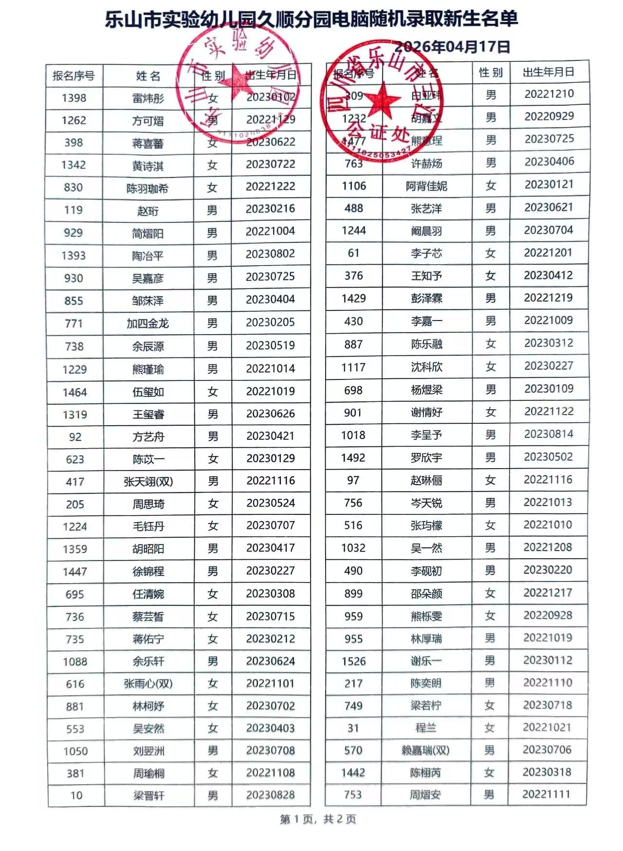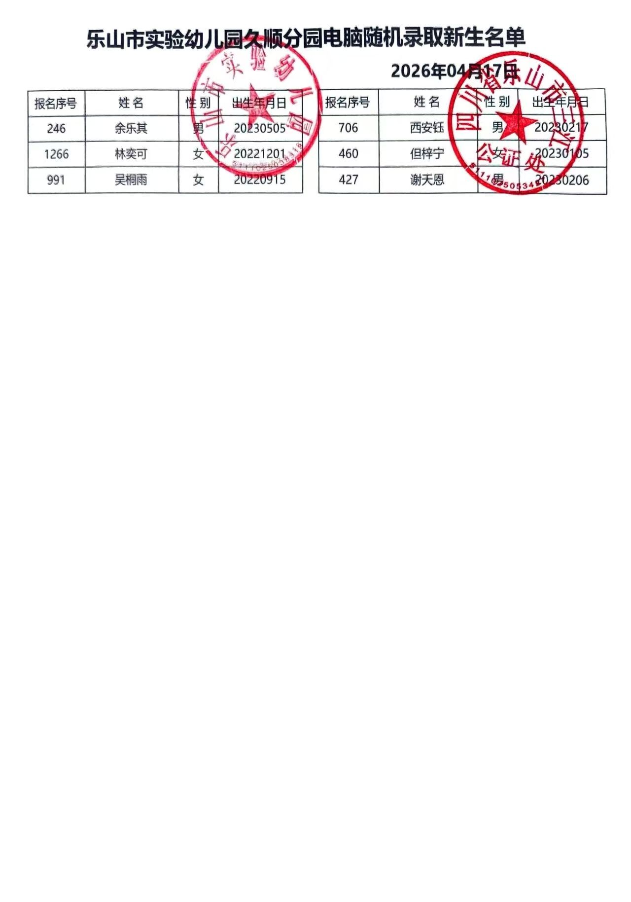 市实幼久顺分园2026年电脑派位新生录取名单