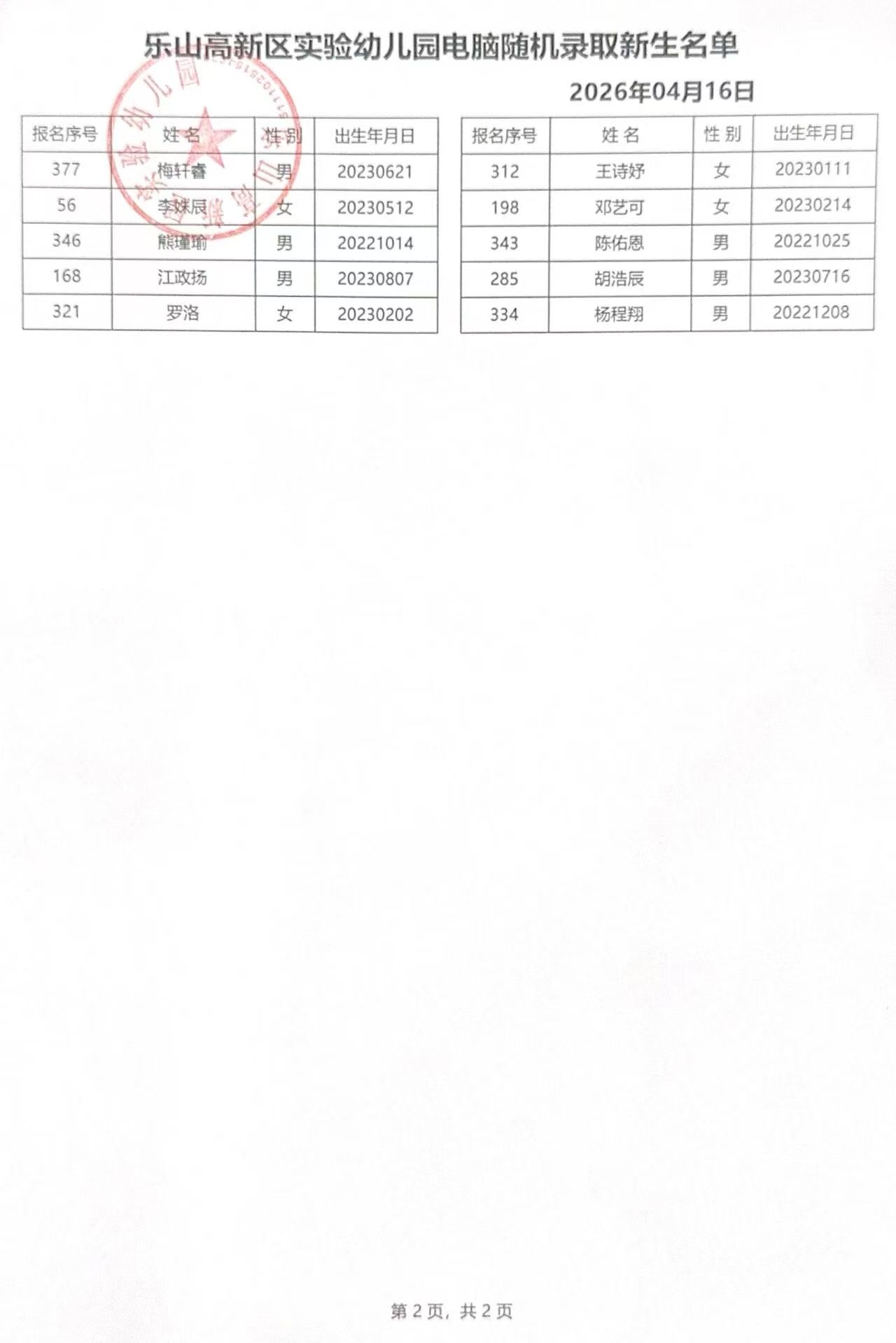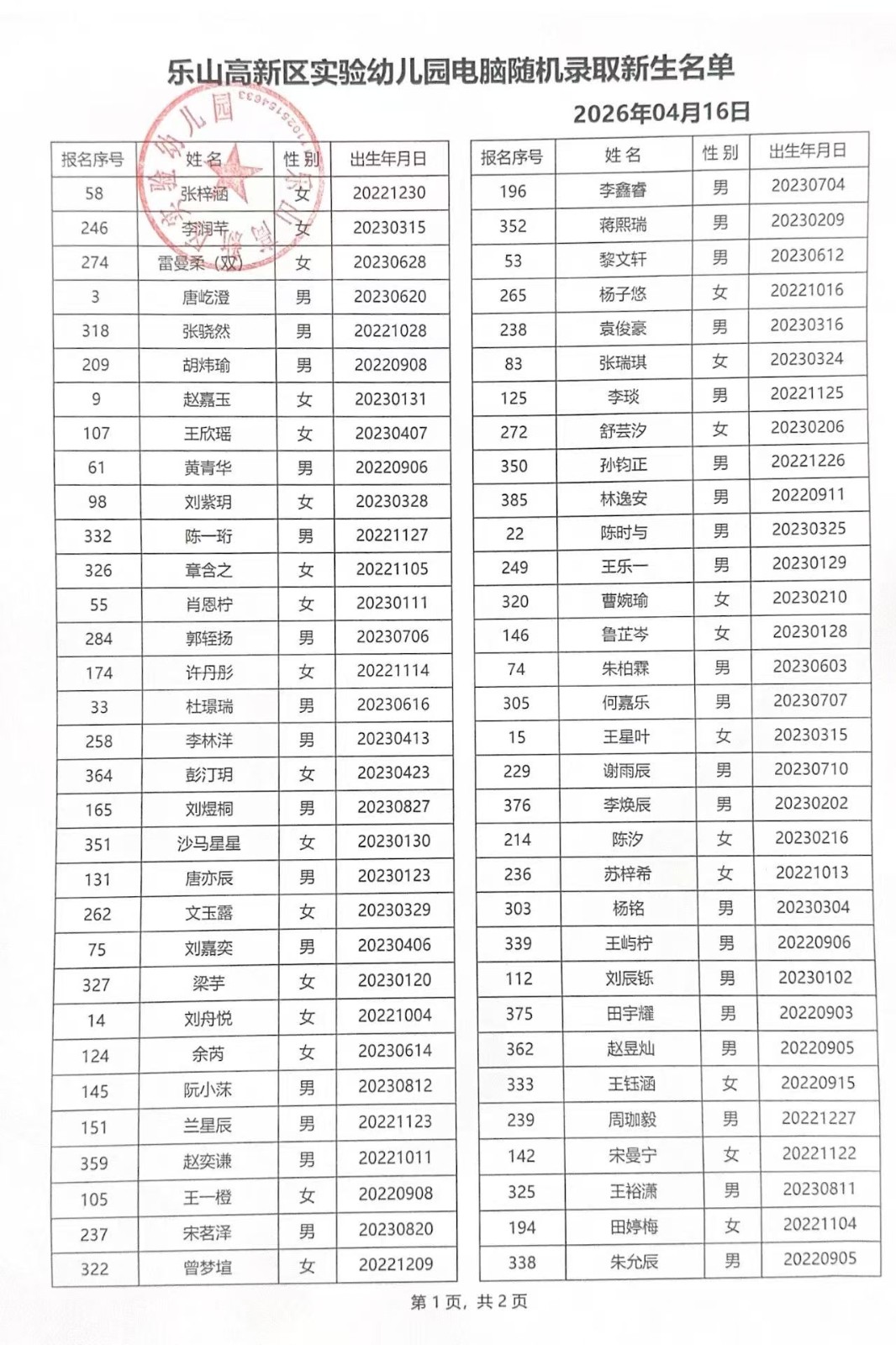 乐山高新区实验幼儿园(市实幼高新区分园)2026年电脑派位新生录取名单