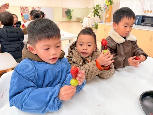 整理水果、洗水果、串糖葫芦、熬糖浆、裹糖衣……孩子们在老师的协助下,一步步完成操作。虽然动作略显稚嫩,但每一个步骤都格外专注。当金黄透亮的糖浆裹住新鲜水果,空气中弥漫开浓郁的甜香,孩子们睁着好奇的大眼睛,满心期待着甜蜜成果。