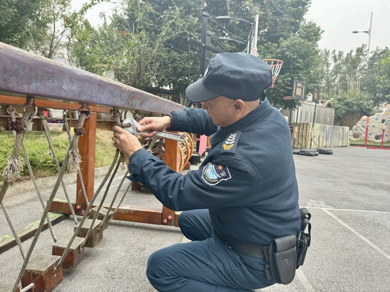 他们微笑着和孩子们打招呼。放学后他们来到户外,蹲在游乐设施旁,指尖捏着扳手,仔细检查螺丝有没有松动,连滑梯的边角都要摸一遍才放心。对他们来说,幼儿园的安全,就是他每天最牵挂的事。