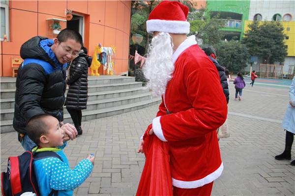 “咦!快看!是圣诞老爷爷!”圣诞老人在幼儿园门口为孩子们带来了糖果。