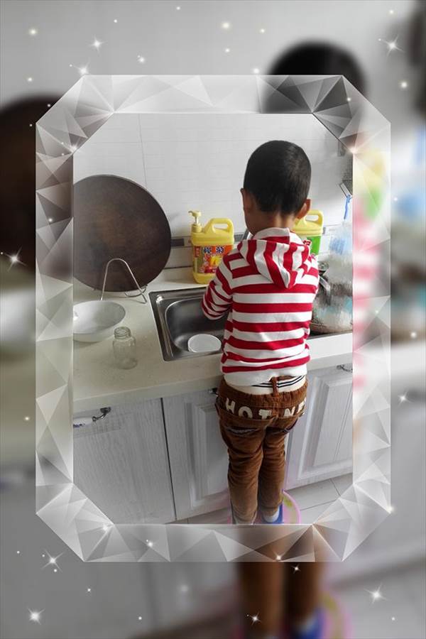 再某日,我在家洗菜,突然水龙头松脱了,水哗啦啦地到处流,我惊叫一声!小家伙匆匆赶来问:“咋个咯?咋个咯!”了解情况后,他赶紧搬来了小凳子,嘴里念着“我来嘛,我来嘛”,便动手帮我修起了水龙头,扭一扭,掉落的龙头又立了起来。
