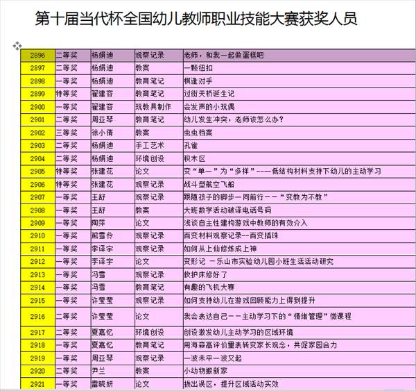 乐山市实验幼儿园教师在《第十届当代杯全国幼儿教师职业技能大赛》中荣获教师特等奖15名,一等奖36名,二等奖15名,三等奖2名。并荣获“先进集体奖”称号。