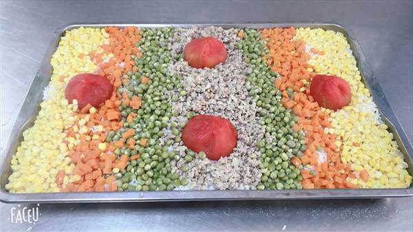 1、大米洗净,胡萝卜、猪肉切粒,玉米剥好,青豆洗净、番茄洗净去皮待用。