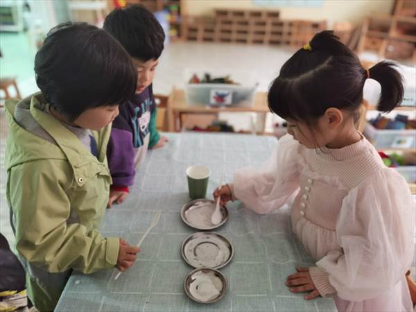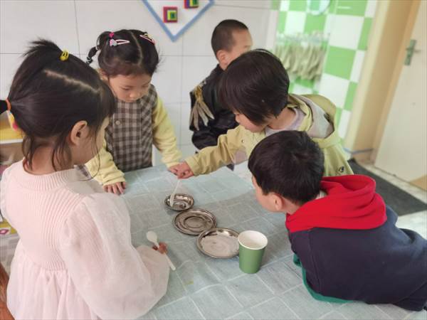 我见过的泡泡 午间休息时间,辰辰分享了洗手时的发现,教师围绕话题和孩子们展开了讨论 师:你们还在哪里见过泡泡呢? 随着已有的生活经验,孩子们积极的表达着自己的发现,在讨论到泡泡怎么做的时候,孩子们的兴趣一下子被点燃,一边发表着自己的看法,一边表示自己想尝试。 尝试做泡泡 材料准备:容器、洗洁精、白糖、水 做法:在容器里加入适量的洗洁精、白糖、再加入温水,搅拌均匀,等白糖融化即可。