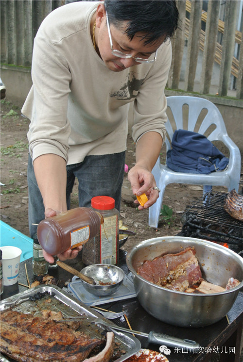 开心的烧烤环节到了,四、五个家庭一组,共七组,爸爸妈妈们纷纷大显身手,只见他们有的穿肉,有的穿土豆片,有的包饺子,有的烤面包,有的烤肉串……只见他们有序地把各种各样的烧烤物放到烧烤盘上,刷油、翻转……食物在架子上滋滋作响,逐渐变的金灿灿,孩子们则在一旁又蹦又跳,手里举着诱人的食物雀跃不已,此时欢声笑语连成一片。