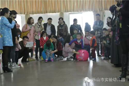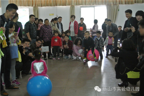 来到目的地,宝宝们向家长们表演了歌舞,接着玩“夹球跳”、“羊角球”接力游戏;家长和宝宝一起玩“吃饼干”游戏,宝宝将饼干放到家长的额头上,要求家长自己在不能用手、不要别人帮忙的情况下把饼干吃到嘴里,看到爸爸妈妈们摇头晃脑动鼻子挤眼睛,努力吃饼干的样子,宝宝们开心得手舞足蹈,家长们也乐成一片……