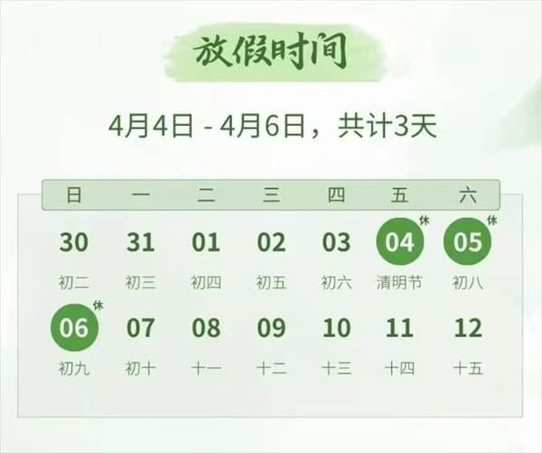 清明放假通知 市实幼的家人们: 清明将至,为了让孩子度过一个充实、平安的假期,现将2025年清明节假期安排及注意事项通知如下,请家长们监护、教育工作,与孩子一同度过愉快的假期。 VOL. 01清明放假 根据《国务院办公厅关于2025年部分节日安排的通知》,2025年清明节放假安排具体通知如下: 放假时间:4月4日(周五)-4月6日放假,共3天4月7日(星期一)正常上学。 VOL. 02清明习俗 习俗一扫墓清明节是传统的春祭大节,清明扫墓,即为“墓祭”,谓之对祖先的“思时之敬”,祭扫祖先是对先人的缅怀方式,其习俗由来久远。我们在尊重祭祖习俗的同时,更呼吁文明祭祀新风尚。我们倡导以献一束花、敬一杯酒、植一棵树、清扫一次墓碑以及网上祭祀等无烟祭扫方式,把祭奠先人的传统习俗和良好愿望用更加环保、健康、安全的方式进行表达,不断提高和丰富个人精神文化内涵,弘扬社会新风正气。 习俗二踏青清明节是中国重要的“时年八节”之一,又称踏青节、行清节、三月节、祭祖节等,既是一个扫墓祭祖的肃穆节日,也是踏青游玩,享受春天的节日。在仲春与暮春之交,也就是冬至后的第108天。与端午节、春节、中秋节并称为中国四大传统节日。 习俗三植树植树风俗一直流传至今。清明节植树的习俗,据说发端于清明戴柳插柳的风俗。关于清明戴柳插柳,有三种传说。第一种传说,据说是为了纪念教民稼穑耕作的祖师—神农氏,后来由此发展出祈求长寿的意蕴。 习俗四放风筝放风筝是清明节人们最喜欢的活动之一 。古代人把风筝放上天后,便会剪断牵线,任凭清风把它们吹到天涯海角,据说这样可以消除冰灾,给自己带来好运。 习俗五吃青团在传统的观念中,人们认为,糯米粘在一起就像亲情一样,所以在清明节,吃青团也是表达对逝去亲人亲情的一种方式。 VOL. 03温馨提示 1春季昼夜温差大,有时中午还日光灼人,早晚却凉意袭人。体质弱的孩子很难适应气温变化,容易着凉感冒,家长要根据天气变化和孩子的身体状况适时增减衣服。 2牢固树立“保护森林就是保护自己”的观念,切实增强森林防火意识,自觉遵守森林防火有关规定。森林防火,人人有责。 3带孩子外出时,切记“珍爱生命,安全第一”,自觉遵守交通法规并教育孩子遵守交通规则,倡导文明出行。骑乘摩托车、电动自行车时自觉佩戴安全头盔;驾乘汽车时,驾驶员和乘客规范使用安全带;做守法典范,不冲红灯、不逆行、不抢道,杜绝无证驾驶、酒后驾驶、超速超载等交通违法行为。 4家长要监护好孩子安全,不要私自玩水或在无安全设施的地方玩水,切勿让孩子靠近河流、池塘等水域,防止溺水。 5清明假期正值春季传染病高发期,请家长根据流行病、传染病的特点,做好各种疾病的预防工作。 6讲究饮食卫生,不购买或食用“三无”食品、过期变质的食品,食用水果应清洗、削皮,饭前便后要洗手,防止病从口入。