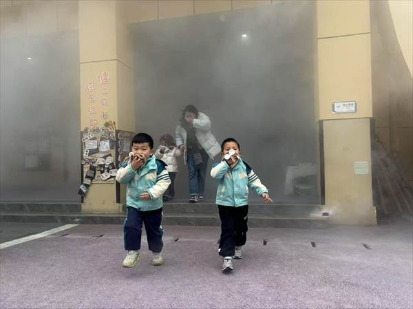 幼儿们捂住口鼻,压低身体小步快走,井然有序地,按照每个班级的安全路线进行撤离,集合到空旷的操场上。