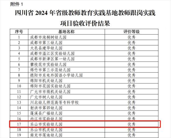 近日,乐山市实验幼儿园圆满完成了2024年四川省省级教师教育实践教师跟岗培训项目,以“三‘N’联动”培训模式为核心,实现参培教师满意度100%的卓越成效,再次彰显了我园作为省级教师教育实践基地的示范引领作用。根据四川省教师发展中心公布的2024年省级教师教育实践基地教师跟岗实践项目验收评价结果,乐山市实验幼儿园获评“优秀基地”;其形成《精准施策、三“N”联动,构建教师专业成长生态闭环》典型经验入选四川省教师教育实践基地2024年度优秀培训案例;我园肖芸怡老师凭借其系统化课程设计与动态指导能力,被评为“优秀导师”。