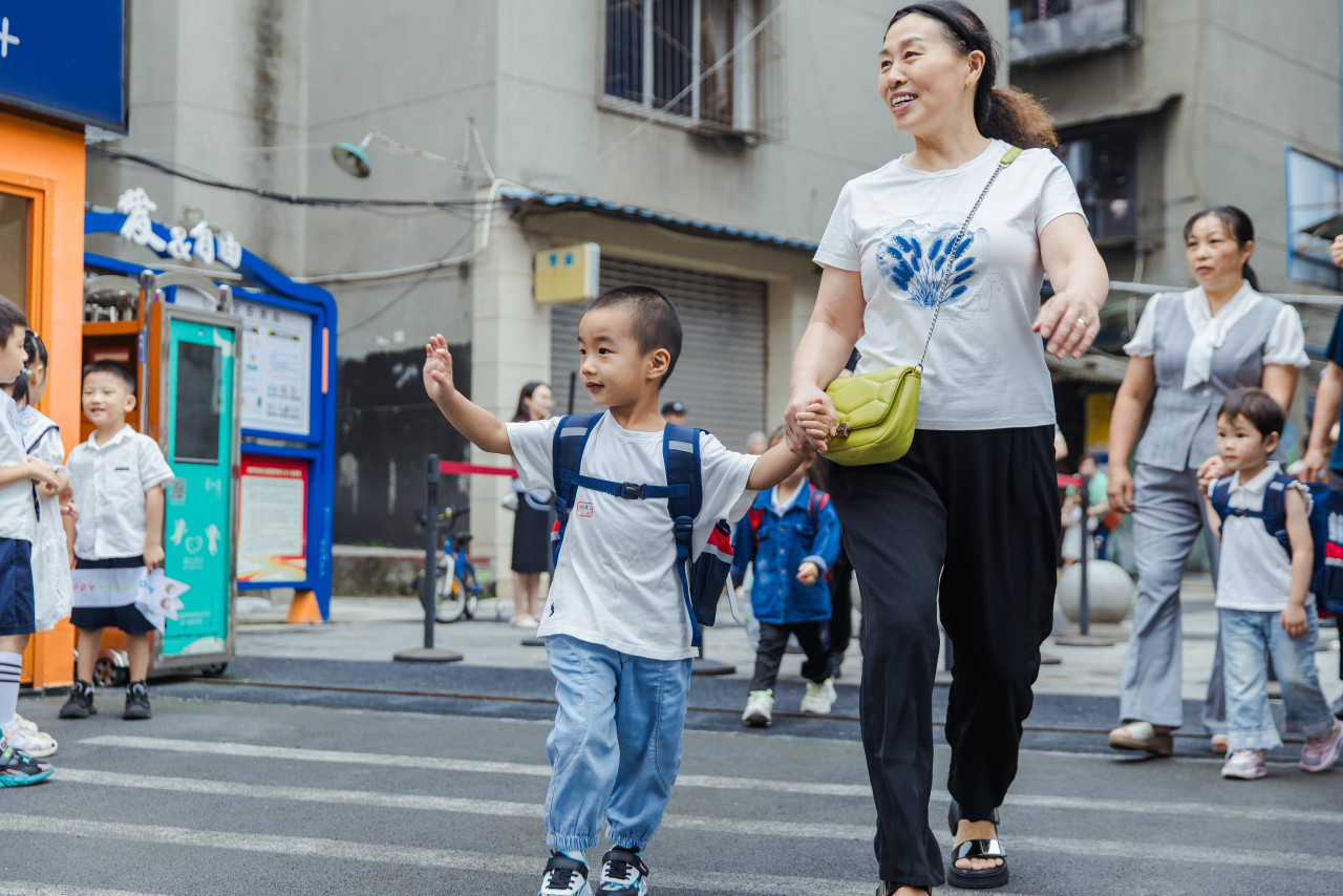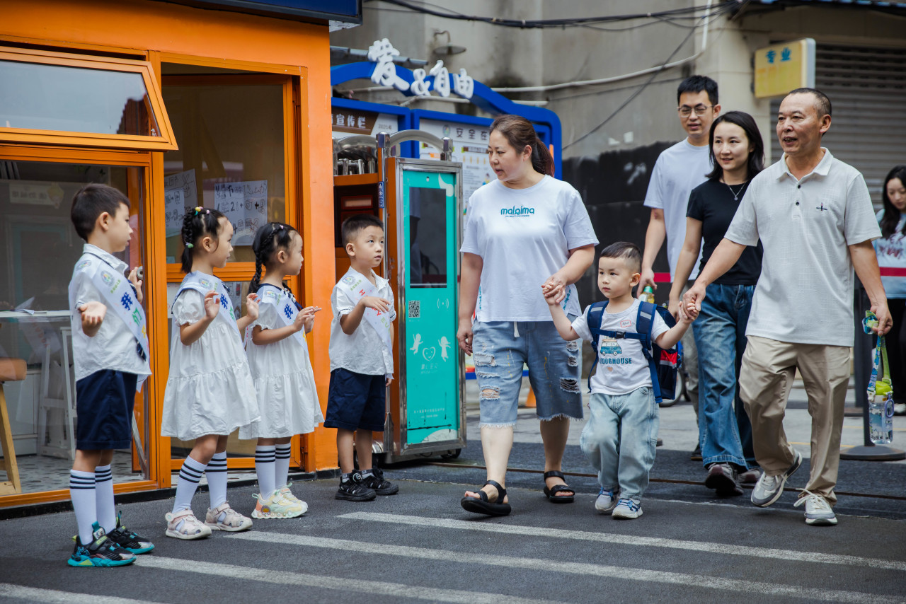 在幼儿园门口迎接孩子们“回家”