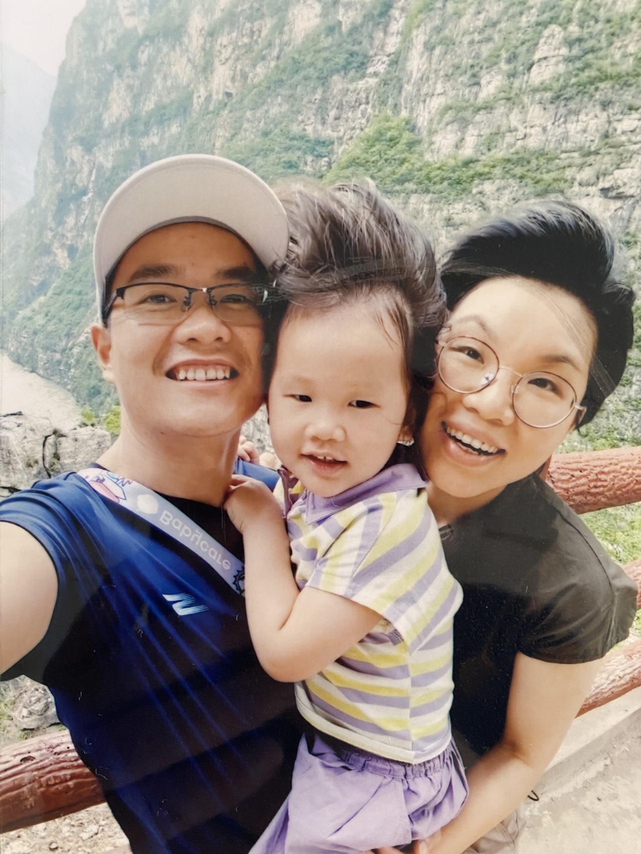 六一:这是我的爸爸妈妈和我,我们一起去爬山旅游的时候拍的照片,很开心。