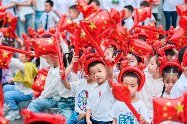 一幅长卷,铺开祖国壮美的山河图景;一面红旗,凝聚孩子们最真挚的赤子之心。孩子们伏身于画卷之上,用稚嫩的笔触描绘天安门、长城,每一笔色彩都是对祖国最深情的告白。