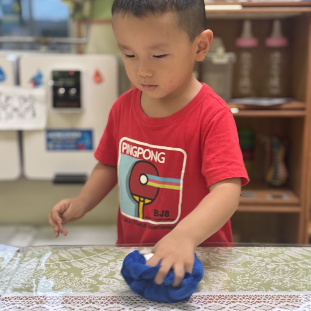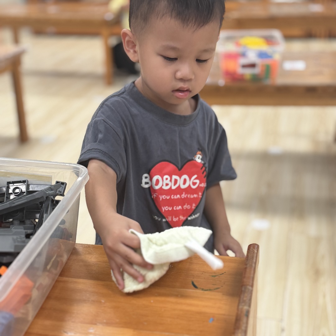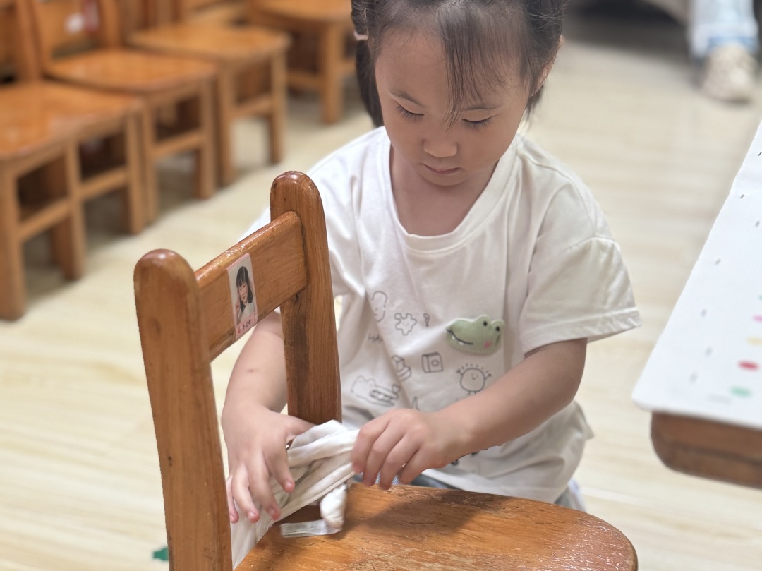 崭新的一天从晨间劳动开始,用抹布擦拭自己的小椅子,给植物角的绿植浇水。简单的劳动,培养的是责任心和爱整洁的好习惯。