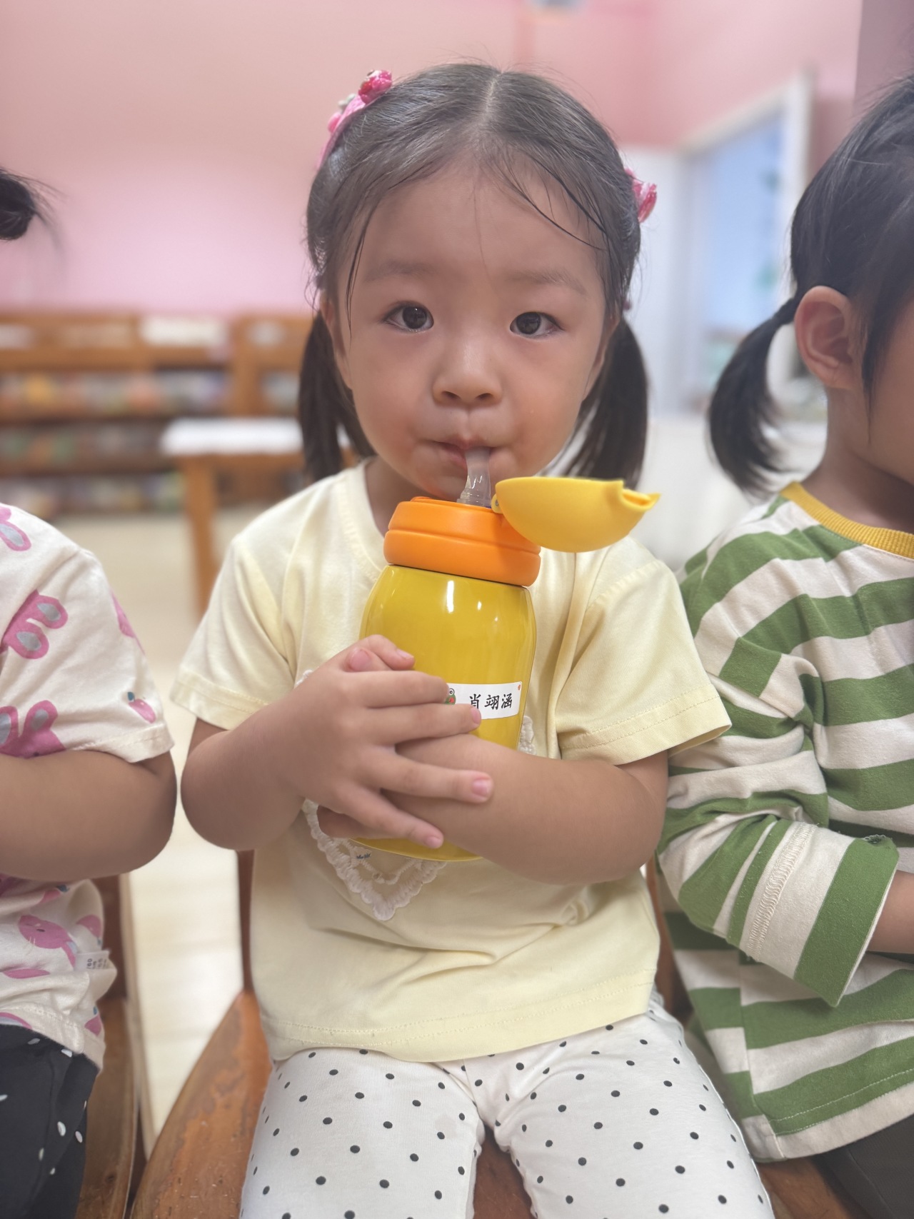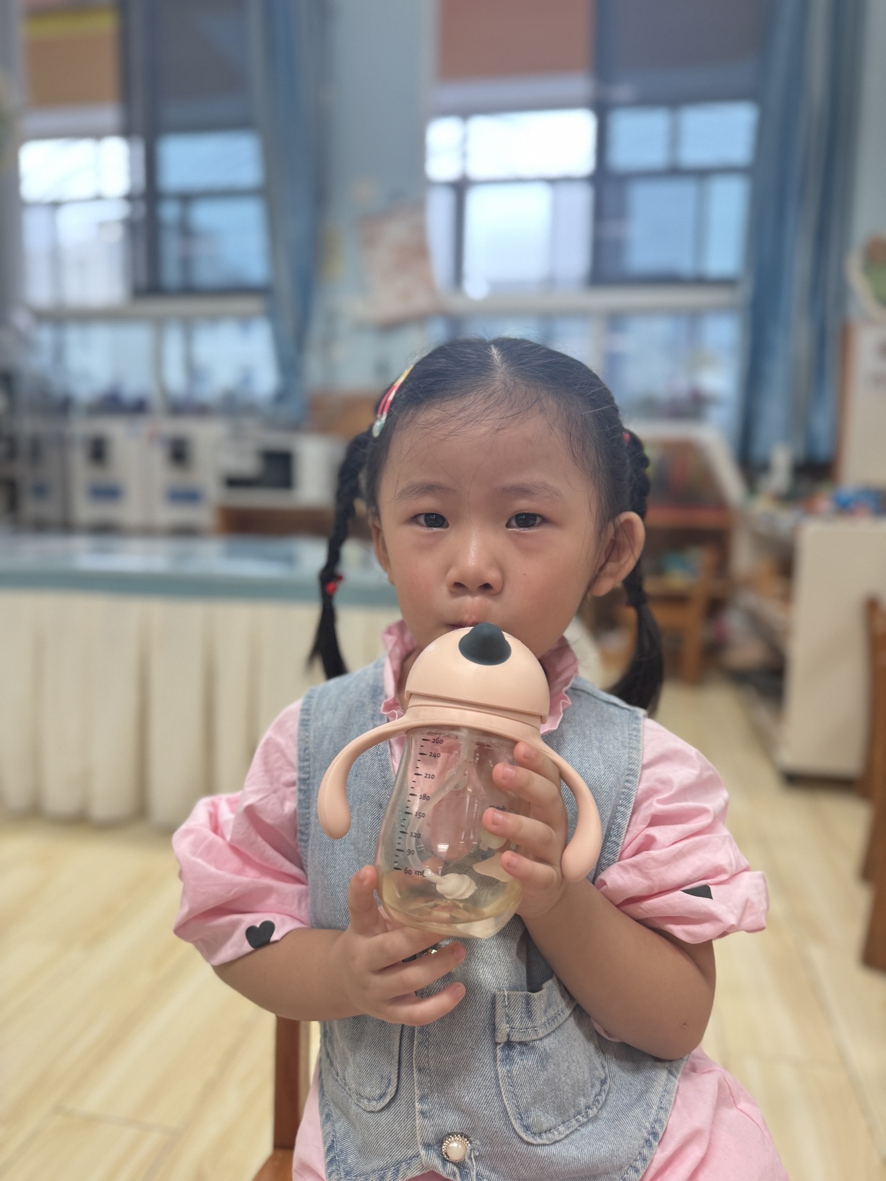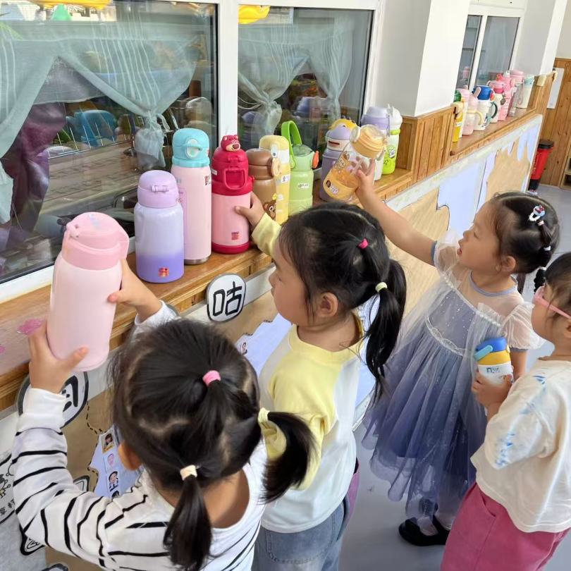 教室里,老师根据本班孩子的喜好,用寓教于乐的方式鼓励他们喝水,养成了主动喝水、喜欢喝水的好习惯。