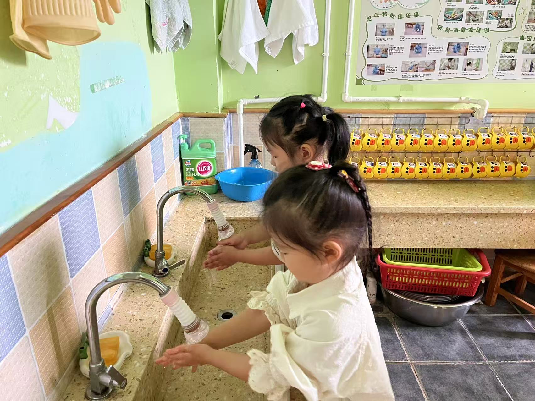 “两个好朋友,手碰手……”伴随着洗手儿歌,孩子们认真使用着“七步洗手法”。流动水冲洗,肥皂搓揉,每个步骤都不马虎,把细菌统统赶跑!