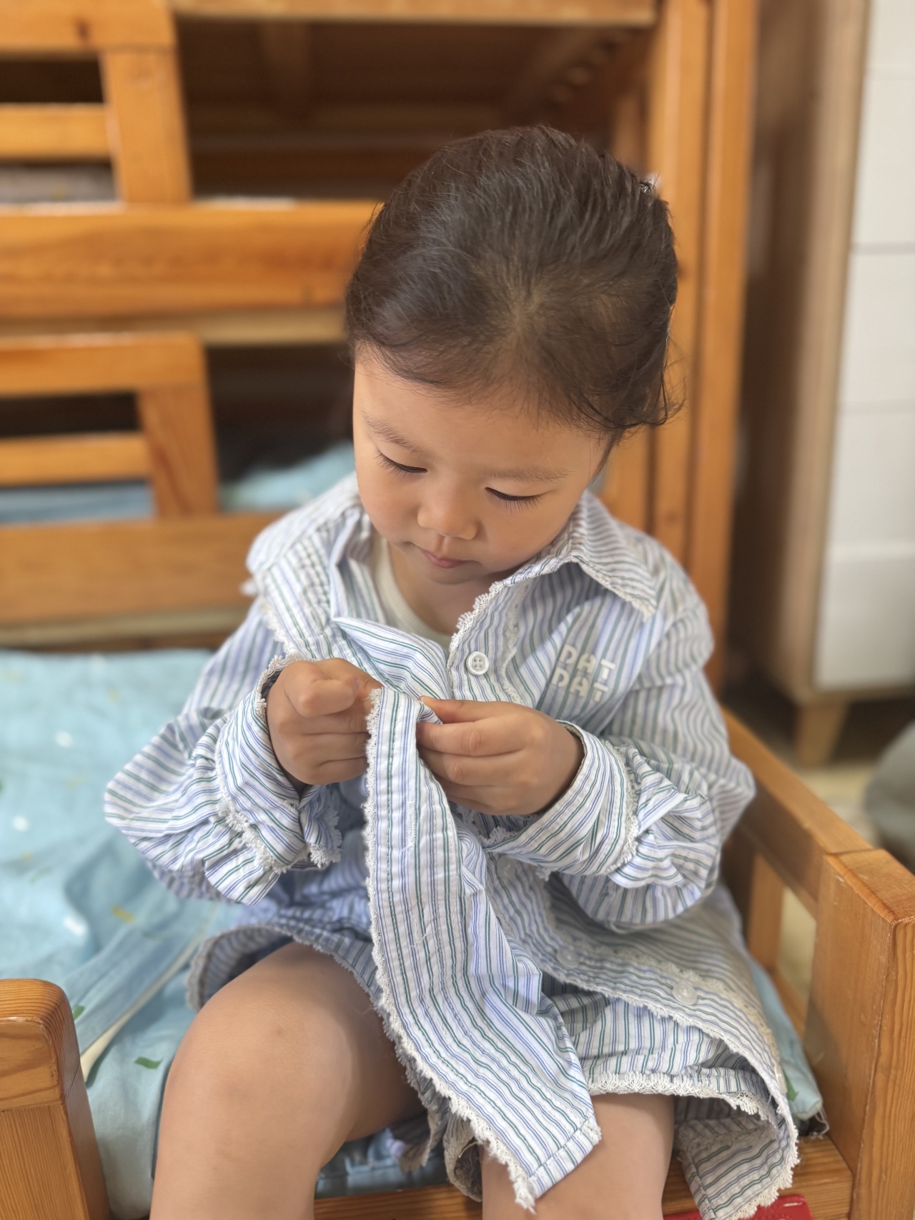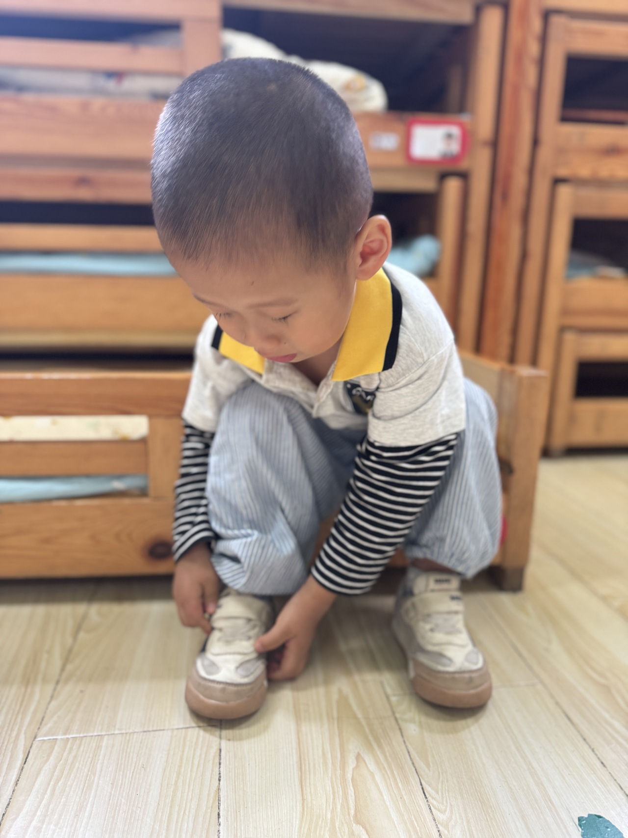 午睡后的穿衣环节是最受欢迎的时刻!“钻山洞”穿套头衫,“小火车过隧道”穿裤子,“贴贴乐”穿魔术贴鞋子——在朗朗上口的儿歌中,穿衣穿鞋变成了有趣的游戏。