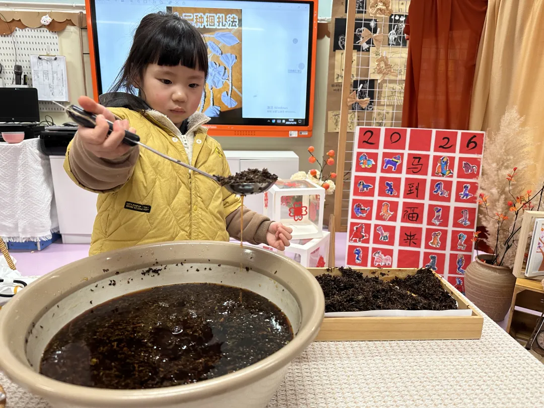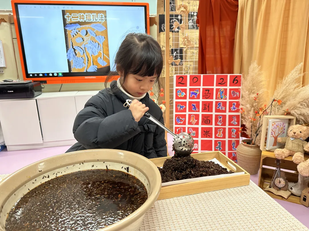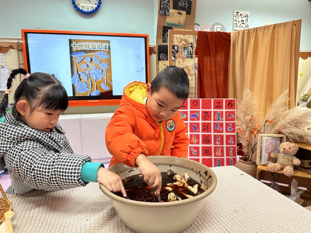 通过图片、视频,孩子们了解到茶染是中国一种古老而独特的纺织品染色工艺,主要分为扎结和染色两部分。素白的棉布或是丝绸浸入由茶叶熬制的染液中,随着时间的流逝和温度的变化,织物逐渐呈现出灰褐、茶棕等天然色泽,每一幅作品纹路都像山水画,独一无二。