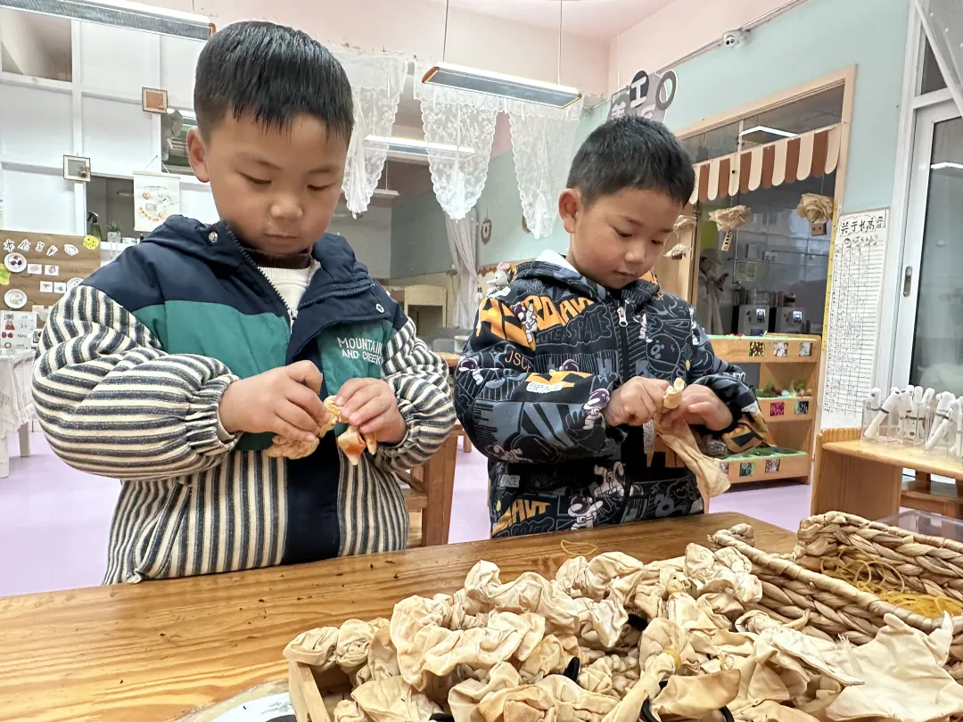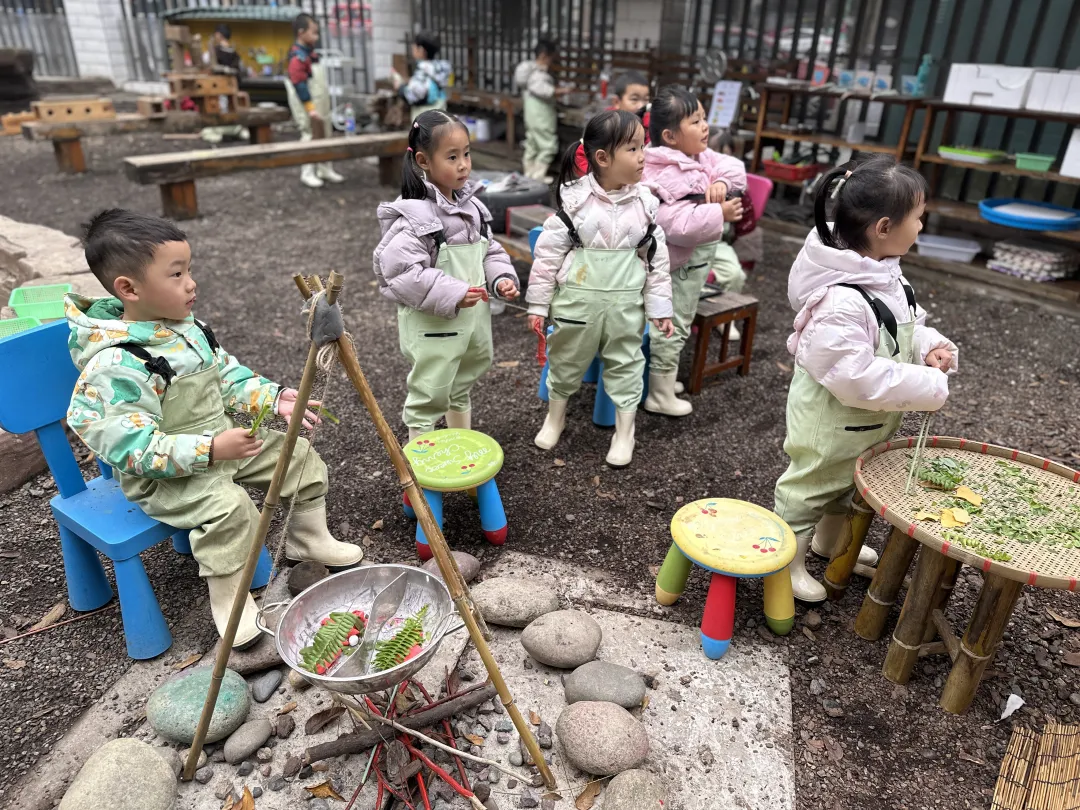 2025年12月,户外活动,孩子们将树叶晒干制成“茶叶”,玩起了“煮茶”游戏,意外发现洒出的“茶水”会让白色的衣服染色,一场关于“茶染”的探究之旅就这样自然开启。
