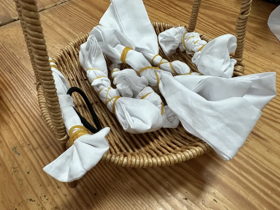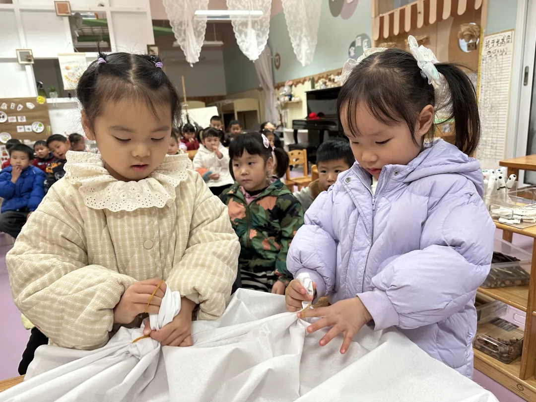 孩子们将白布用皮筋扎成自己喜欢的方式,