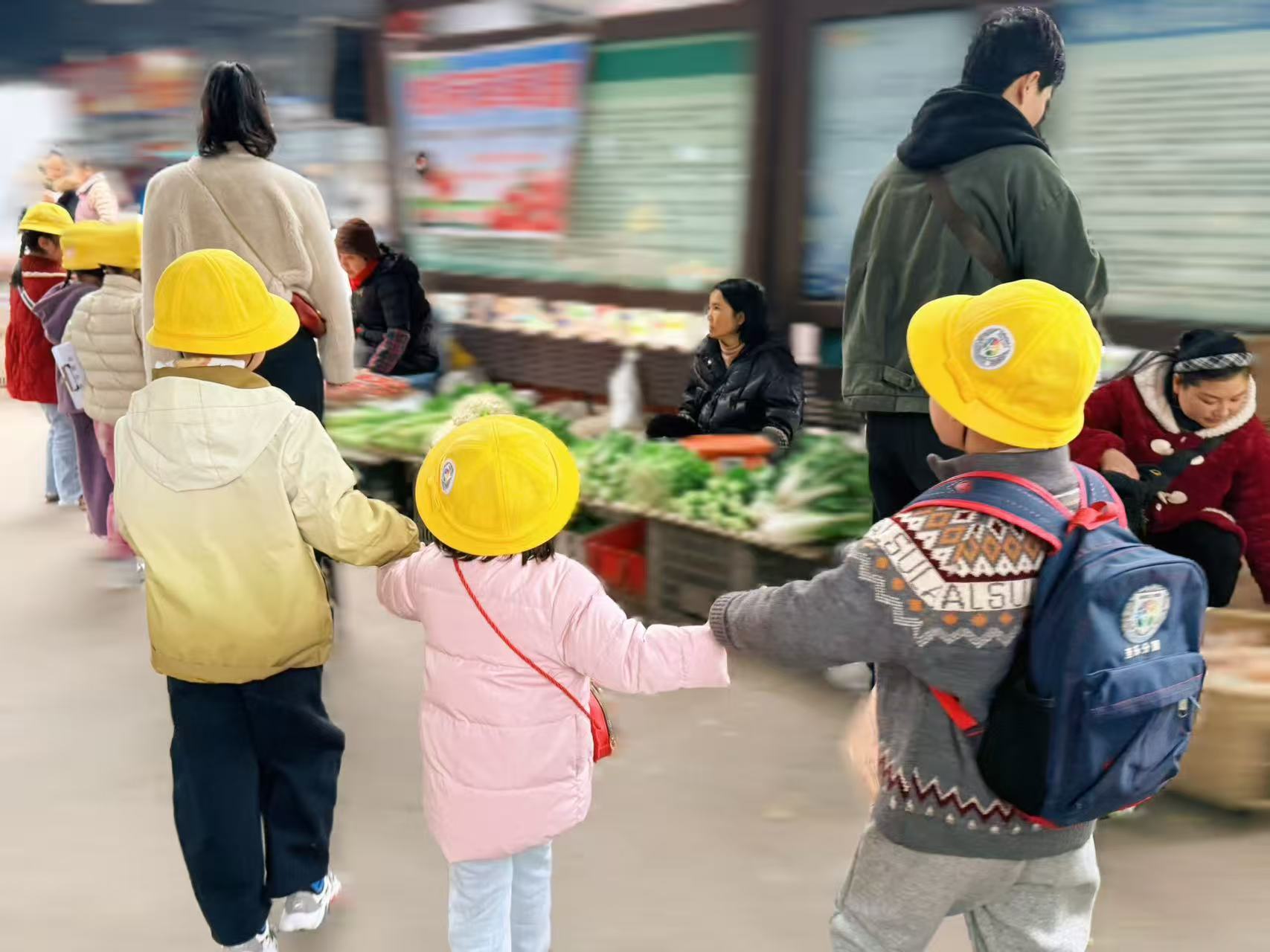 孩子们凭借触摸的触感与敏锐的观察,争相喊出食材名字,稚嫩的童声里满是自信与欢喜。 始于生活不止生活 ;随后,老师通过抽签完成四组分队,并讲解“不离开视线、不触碰危险物品、不大声喧哗”的“三不原则”安全守则,为即将到来的市场探秘筑牢安全防线。