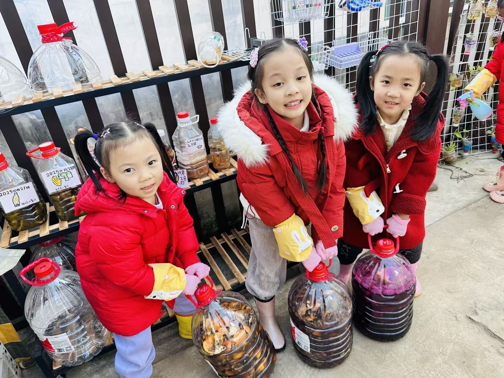 果皮变变变,肥肥土里藏 周鸿艳 午后,大四班的孩子们漫步在菜地旁,只见几株青菜的叶片边缘发枯发黄,没了往日的翠绿生机。孩子们一下子围了过来,大家都在猜测菜叶变黄的原因。老师紧扣《3-6岁儿童学习与发展指南》科学领域“亲近自然,喜欢探究”的目标要求, 顺势引导孩子们带着问题展开观察:对比健康青菜的形态特征,猜测菜叶发黄的原因。一场关于果皮堆肥滋养菜地为核心的科学探索课程,悄悄拉开了序幕。 初识有机肥一定是我们没有经常来给它们浇水。才不是,我婆婆每次种菜就会撒肥料进去。对,没有肥料就没有营养。可是我们没有肥料怎么办呢? 孩子们你一言,我一语的交流着,蔬菜变黄的原因,我们知道,真正的学习要从“解惑”开始。 1了解肥料:我婆婆把不要的菜叶子丢进水里。我看见曾老师用过白色的肥料。还有那种黑黑的,闻起来还有点香。孩子们通过谈论,了解了肥料的多样性。 于是我们又开始了一场班级谈话活动 教师的思考:《纲要》明确指出:“幼儿的科学教育是科学启蒙教育,重在激发幼儿的认识兴趣和探究欲望。”幼儿学习科学的过程应该是幼儿主动探索的过程。产生学习兴趣继而形成积极主动的学习品质。 探秘堆肥在分享环节,孩子们积极交流,提到了可以用果皮、蔬菜来进行堆肥。那我们该用什么材料来堆肥呢?从哪里去收集?可以用瓶子,很多瓶子。我们每天都会吃水果,可以把水果皮留下来。其他班也有,我们可以去收集。还可以请厨房阿姨,把不要的菜叶送给我们。 教师的思考:孩子们自主规划材料收集、工具选择,通过讨论协商、民主投票确定堆肥方法,展现出良好的问题解决与决策能力。教师应持续支持这种以幼儿为主体的探究活动,在实践中培养其责任感、合作意识与科学探究精神。 第一次尝试:孩子们开始尝试第一次制作:收集果皮,菜叶、将果皮、菜叶装入瓶中。第一步:将果皮、蔬菜放入瓶中。第二步:将盖子拧紧。第三步:记录日期完成后,孩子们每天去农科小院的第一件事就是跑到堆肥处查看,期待果皮能够赶紧能够成为肥料。可是......熹熹:不对呀,我婆婆的堆肥桶里面有水。桐桐:对,这些蔬菜果皮只有颜色变了,一点水都没有。梓铭:那我们需要加一些水进去才可以。2周后,孩子们发现堆肥依然没有太大的变化,甚至变得臭臭的。 于是我们一起查询资料,原来是因为缺少了,可以果皮、蔬菜发酵的材料。 教师的思考:教师在幼儿探究过程中应细致观察他们的行为、语言,了解他们的兴趣点和困难点。及时提供所需材料,鼓励幼儿多途径去了解现象背后的原理并且还可以鼓励幼儿通过图画、符号等方式记录自己的探究过程和结果,帮助他们整理和反思经验。提供植物发酵酵素后,孩子们迫不及待的开启了新一轮的尝试。 第二次尝试第一步:将果皮、蔬菜放入瓶中。第二步:放上发酵酵素。第三步:加入清水第四步:拧紧瓶盖完成!持续观察带着改进后的期待,孩子们观察的更加仔细,将每一次的发现记录在观察本上。这里有好多的小泡泡每次打开就会发出“呲”的声音就像把汽水打开一样为什么会发出“呲”的一声呢?现象的秘密:原来液态肥在发酵过程中会释放出二氧化碳和水,随着气体越积越多,瓶子就会因气压变大而鼓起来,拧开瓶盖时气体快速跑出,便会发出“呲”的声响。 教师的思考:从初次尝试的“不太一样”到主动请教,查阅资料、发酵酵素的改进,从发现气泡到理解发酵原理,从焦急等待到有计划的观察记录,孩子们经历了完整的科学探究过程。30天的坚持不仅让他们见证了厨余向肥料的蜕变,更培养了实事求是的科学态度和坚持不懈的探究品质。当幼儿真正成为学习的主人时,他们展现出的问题意识、解决能力和学习力,远远超出了我们的预期。成功了吗???桐桐:2号瓶的水越来越多了熹熹:3号瓶的水怎么变少了佳荧:有一股淡淡的橘子味,一点也不臭。梓铭:什么时候才可以用。生活即教育,生活即课程。随着孩子们的问题越来越多,我们的探索依然在继续......