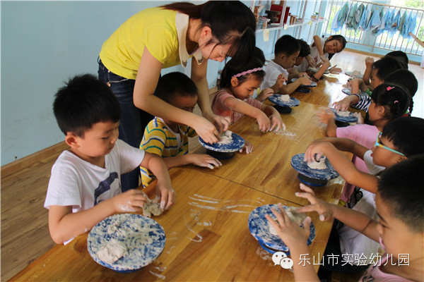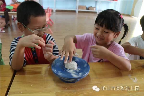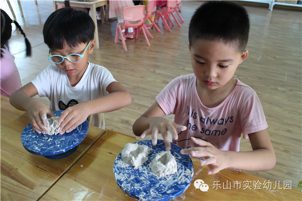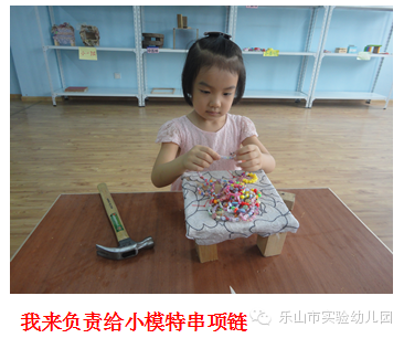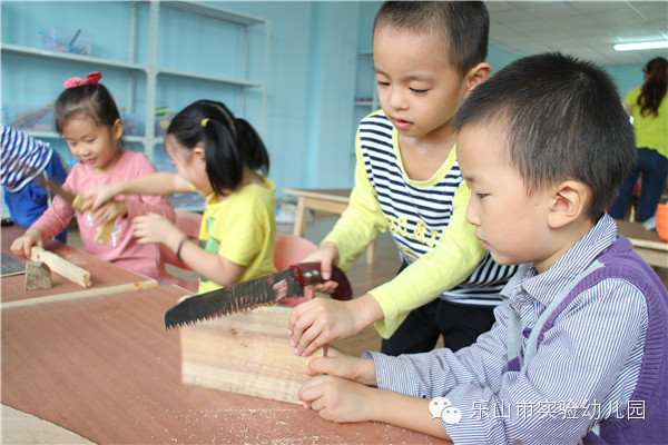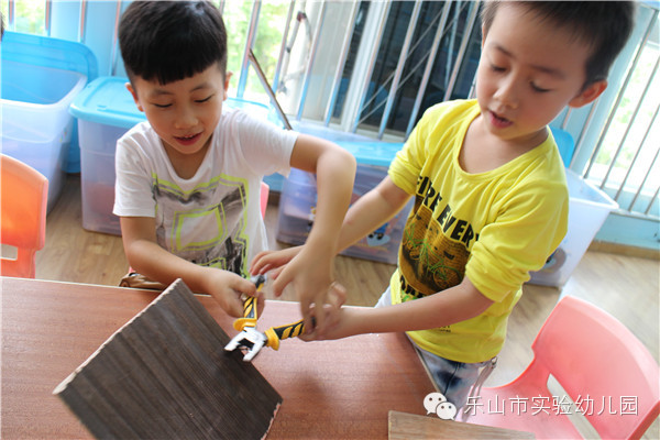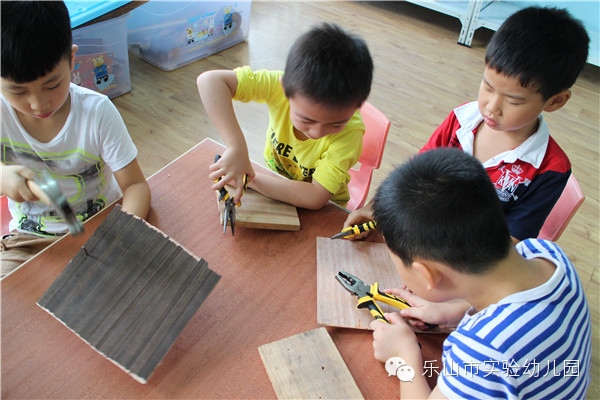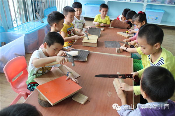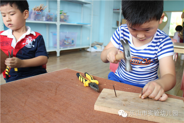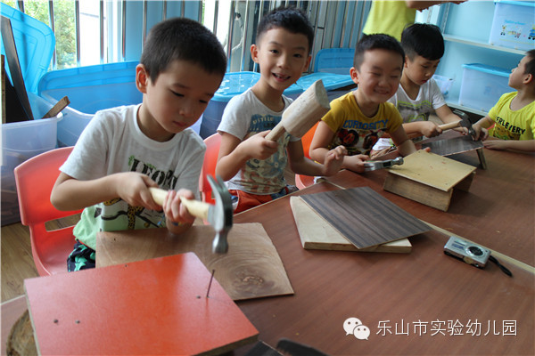 "叮叮叮、咚咚咚……"乐山市实验幼儿园的“宝贝制造工作室”里传来一阵阵敲击声和欢笑声,孩子们正拿着他们心爱的小木头、小锯子、小榔头、钉子、陶土、布料……,开心地“工作”呢。