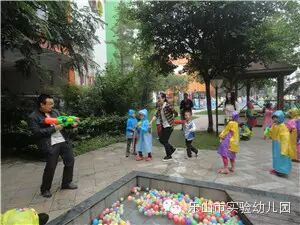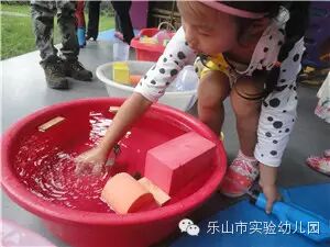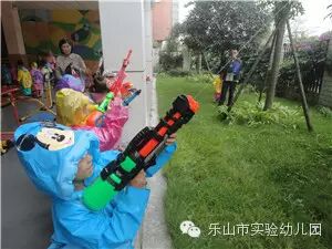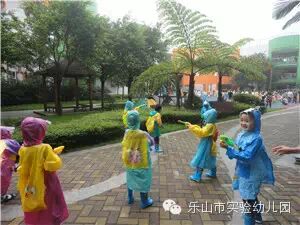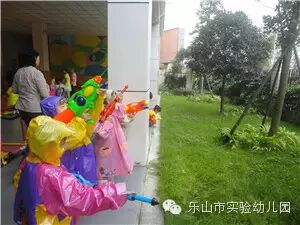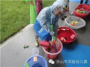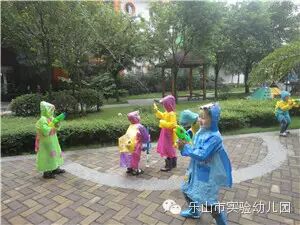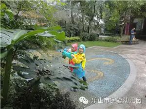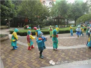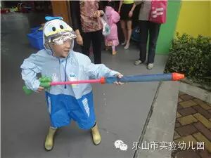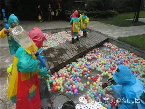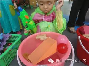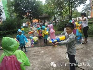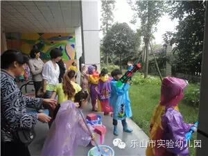 在乐山市实验幼儿园的风雨操场上,正在上演一出别具特色的玩水活动,全体孩子们身穿雨衣手拿小桶、水枪等道具开展玩水活动。在活动中,大六班的孩子们把科学探索活动融入其中,用小石头、小皮球等道具投掷在水中,以观察不同的物品在水中的沉浮现象,既体会了玩水的趣味性,又学习到了科学知识,可谓收获颇丰。