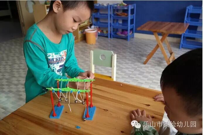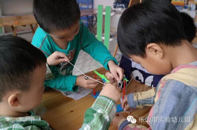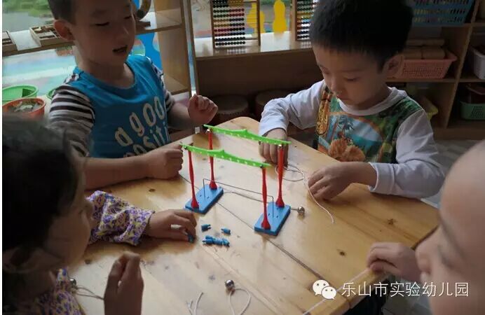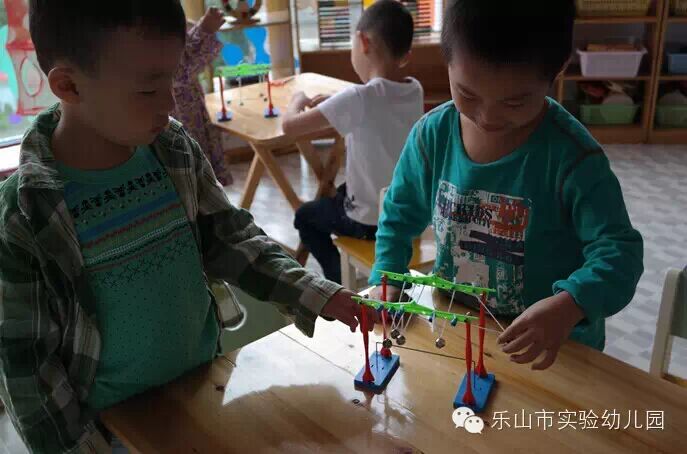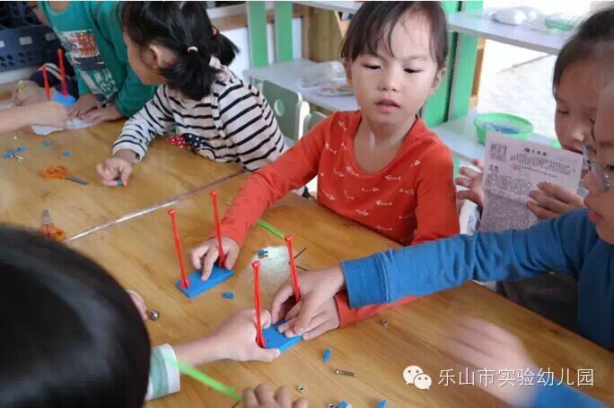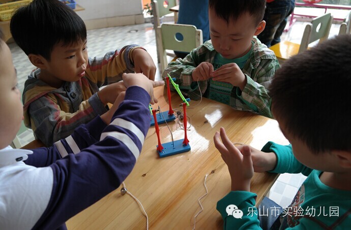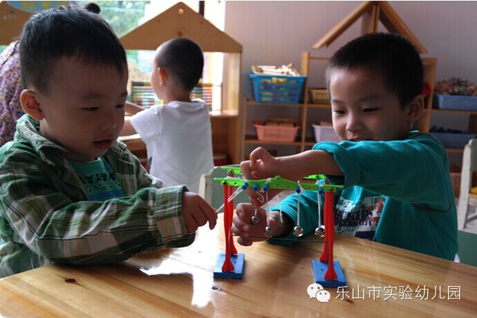 瞧!在今天的区域活动中,市实幼大四班的小朋友们在“科学探索角”通过看看、听听、摸摸,甚至拆拆、装装,组装出了“牛顿摆”。
