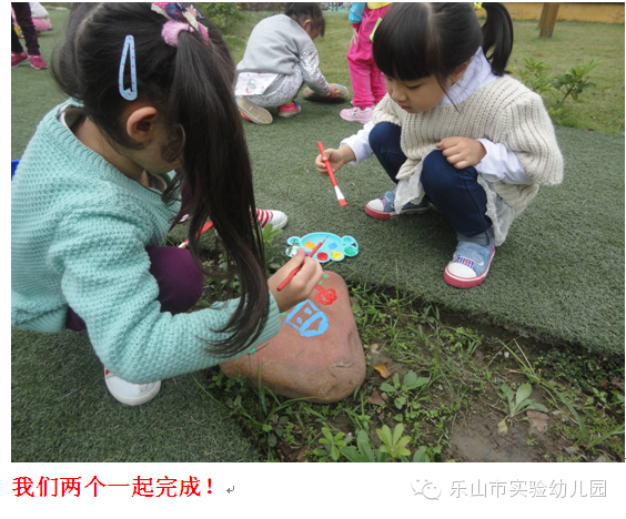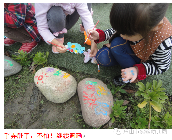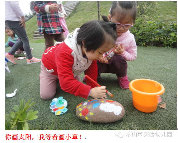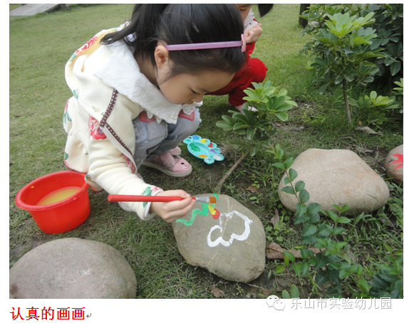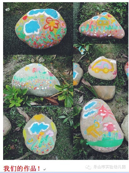 今天,市实幼的孩子们把课堂搬到了户外,把图画纸变成石头,在石头上画画。小朋友们带着小桶,颜料盘,排笔来到了小操场,对着草地边的石头画了起来。他们认真的观察着操场里面的小花小草小树,与同伴讨论着,合作创造着。画好的石头放在草地中,装饰我们美丽的幼儿园。