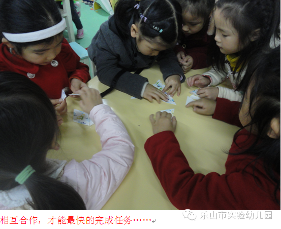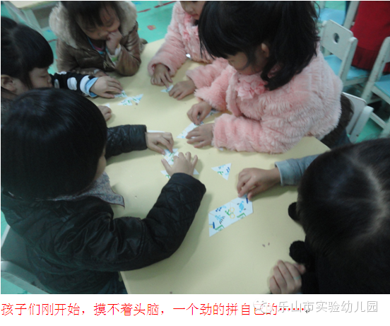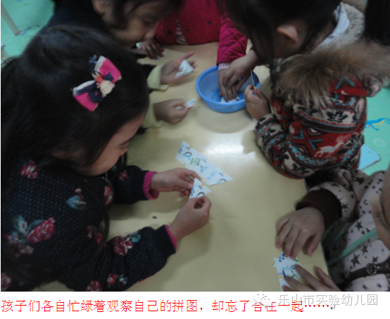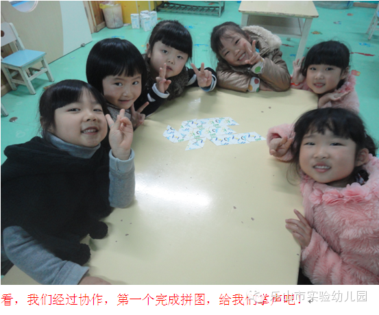 孩子们将散落的拼图部分一一整合,5岁多的孩子自我意识较强。果然,活动一开始,孩子们开始抢拼图碎片,有些抢的多的将自己的碎片拿出来拼时又被别人抢走,所以僵持了许久孩子们的拼图还是原地踏步!这时一个孩子提出:我们选出组长吧,很快有两个组的孩子尝到了有人指挥的甜头后,更是兴致勃勃的用尽心思的去拼凑;相反,有两组的孩子因为不满意组长的指挥而变得焦躁,抢碎片的劲头高过上一浪!最后的结果可想而知!前两组的孩子们体验到了合作的成功与自信,而后两组却是在相互埋怨中结束了活动。