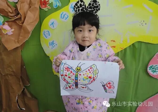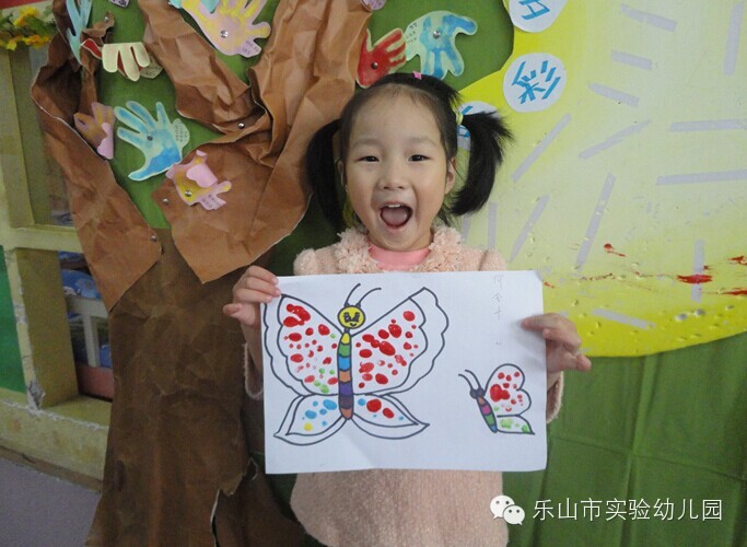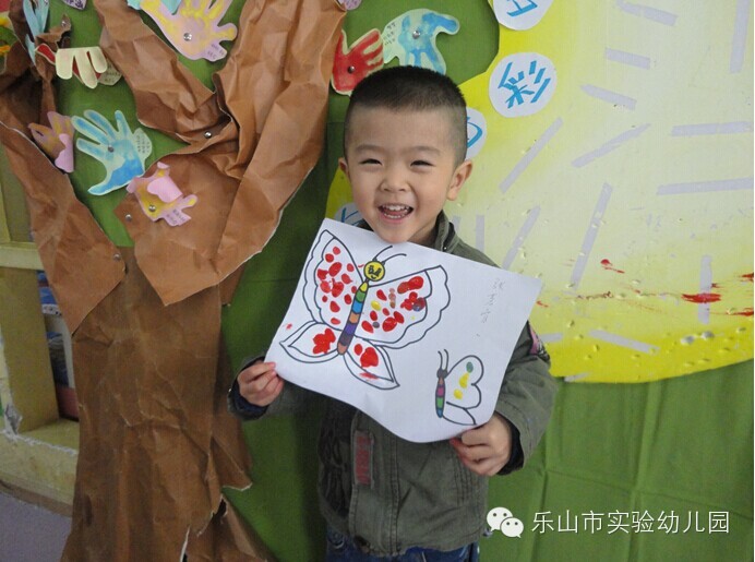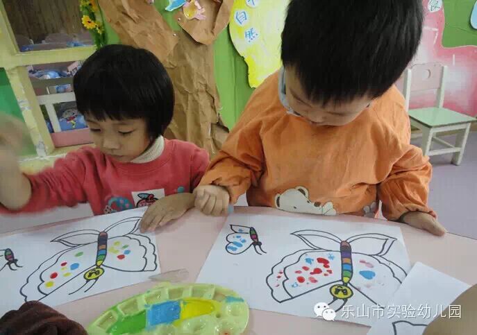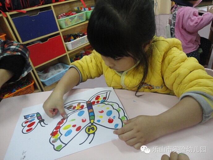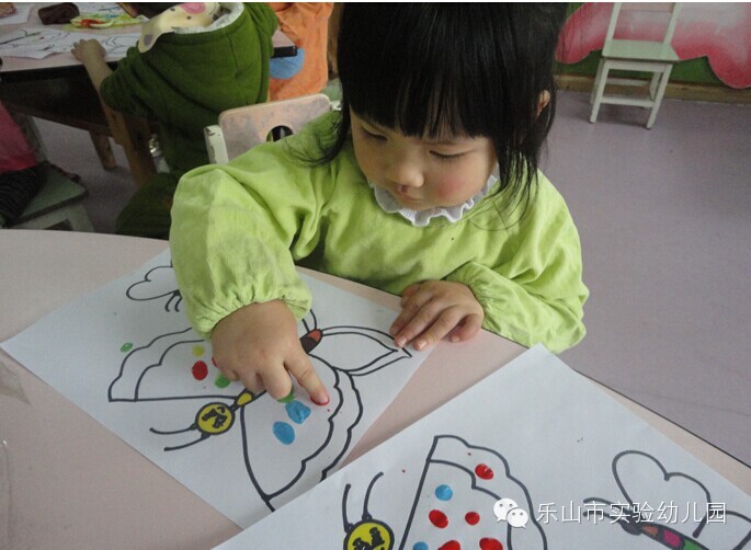 小朋友们纷纷都挽起了袖子,伸出小小指头沾颜料,在蝴蝶的衣服上点一点。指头弟弟可以站起来点画,这样印在蝴蝶的衣服上的花纹要小一点。指头弟弟也可以躺下来点画,这样印的花纹要大一点。小朋友们都乐在其中,纷纷把成品拿到老师面前看。