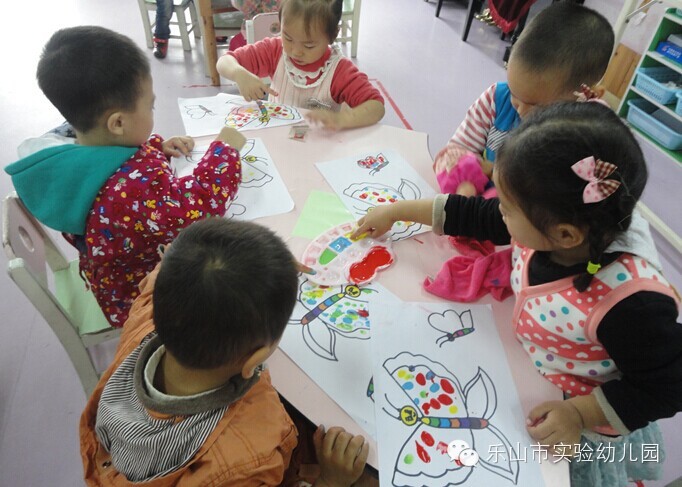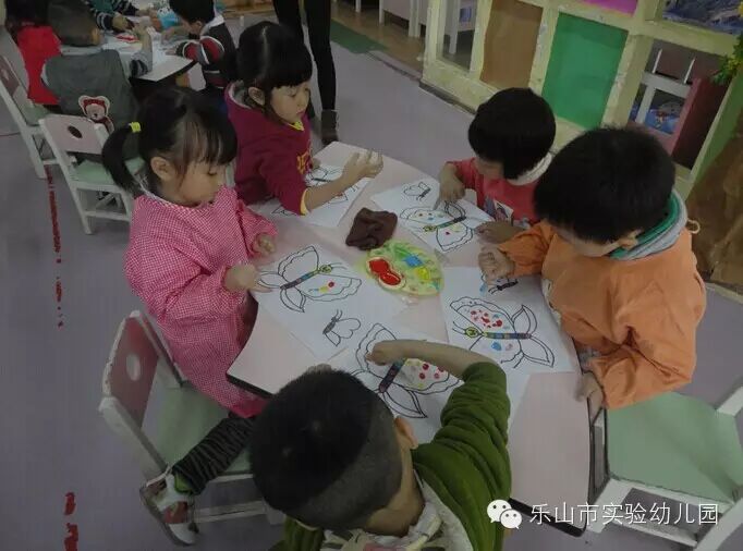 “今天教室里来了好多好多的蝴蝶,但是它们没有漂亮的衣服,让我们帮它们穿上漂亮的衣服吧!”