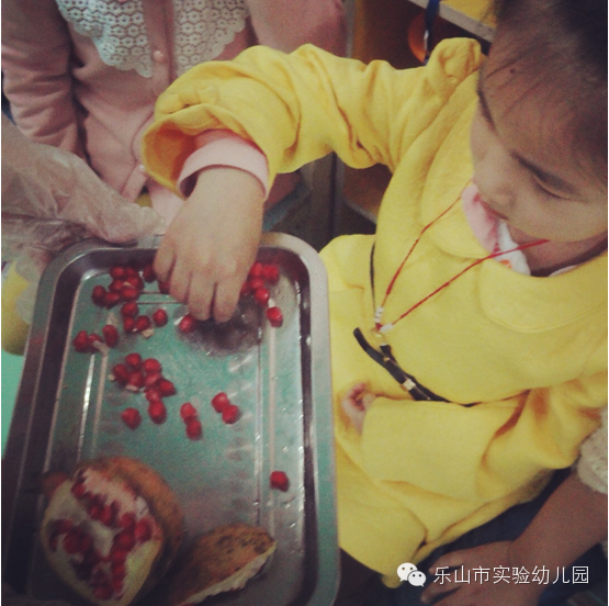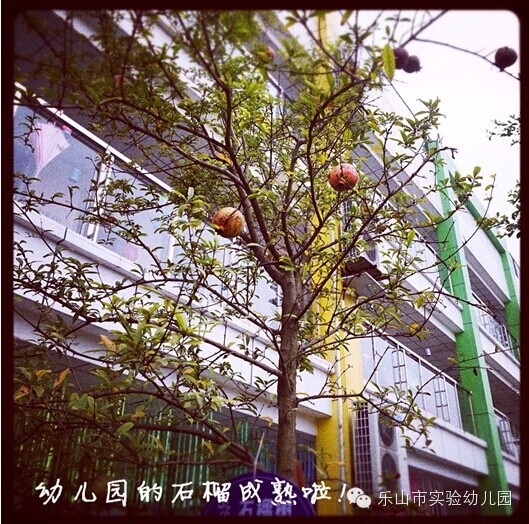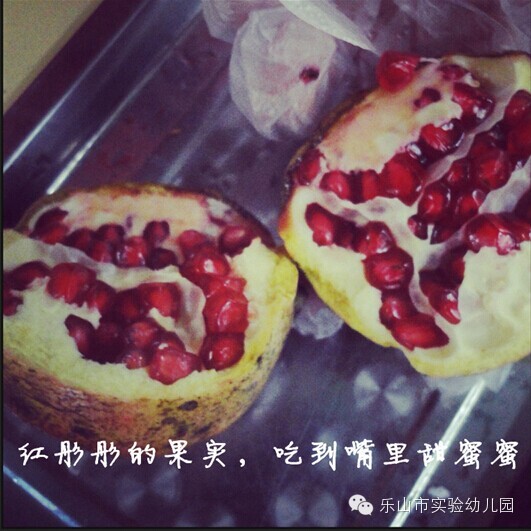 石榴从初夏开花到十月深秋果实成熟,大约要经历五个月的时间。孩子们看着石榴开花,盼着石榴结果。小操场的终于石榴成熟啦!挂在石榴树上的石榴早已红透,十分诱人。今天大三班的小朋友拿起剪刀和梯子来到小操场准备把已经成熟了的石榴摘下来,拿回教室品尝。看到石榴树上结的石榴小朋友们都特别兴奋,都想爬上梯子,亲自体验体验采摘石榴。采摘下来的石榴,熟的都裂开小缝了,几个孩子围在一起迫不及待的吃了起来,特别高兴!