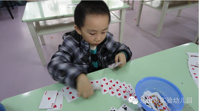 游戏中,聪明的孩子们发现了扑克牌有红色和黑色,还有不同的花色:红桃、黑桃、方片、梅花,还有有数字、有字母,还有小丑等等;孩子们在“开火车——数字接龙”游戏中,发现逐渐增一的规律;在“猜猜谁藏起来了”的游戏中,增强记忆能力;在“猜大小”游戏中提升语言表达能力和逻辑推理能力;在“找相同”游戏中锻炼归纳分类能力。。。。。。