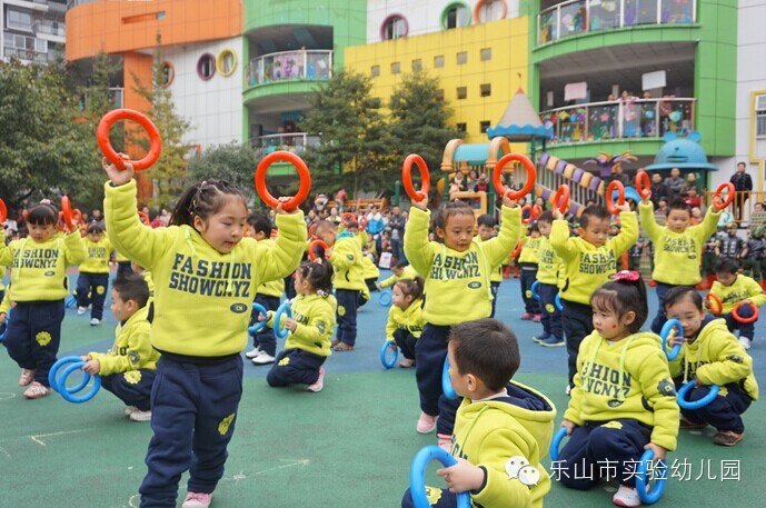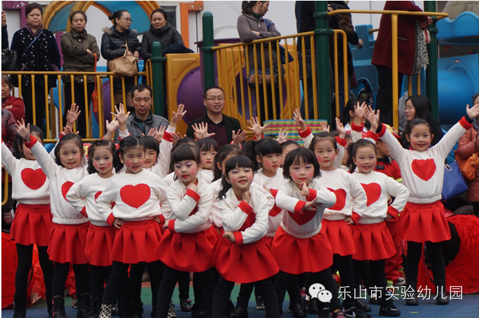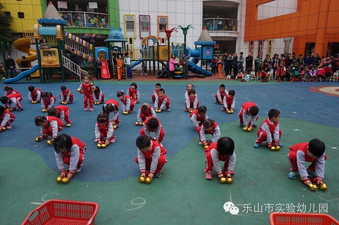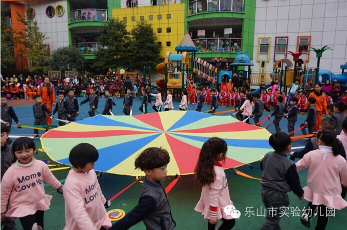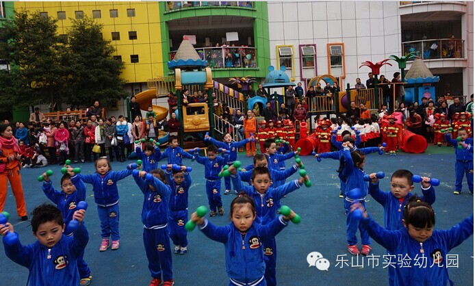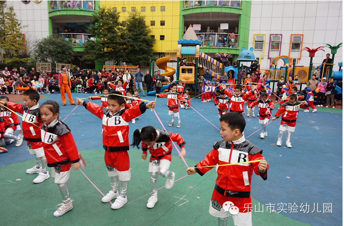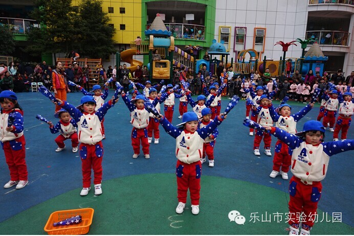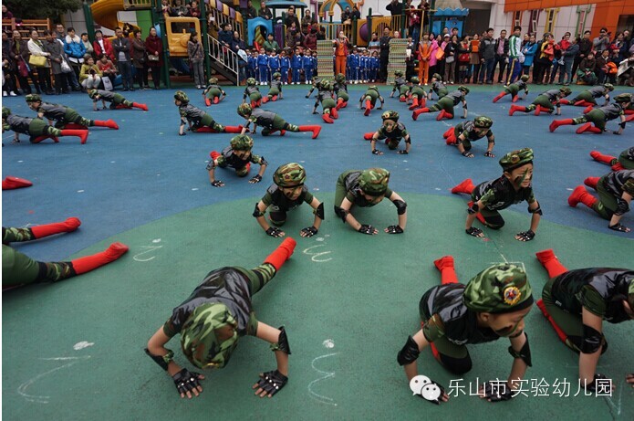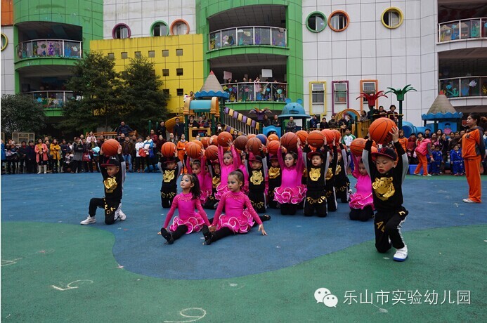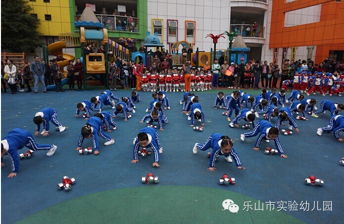 大班团体操更是精彩无比,“雏鹰展翅”用绸带作为天空,孩子们像“雏鹰”一样在空中自由翱翔;“篮球宝贝”创意结合篮球与拉丁舞,真正体现快乐运动;“勇敢向前”运用了多种体育材料,展现了“消防员”勇敢无畏的精神;“小小迷彩”孩子们在体验迷彩兵们坚强勇敢中,身体各方面获得了发展;“炫酷绳操”橡皮绳在孩子们的手中千变万化,创意无处不在;“快乐宝贝”则新颖的玩出了彩虹伞的多种玩法。