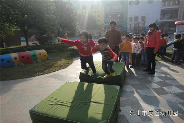来到第一关“飞跃黄河”,孩子们还有点不适应突如其来的跨越宽度,显得小心翼翼,在几番调整后,“飞跃”技能进步神速!