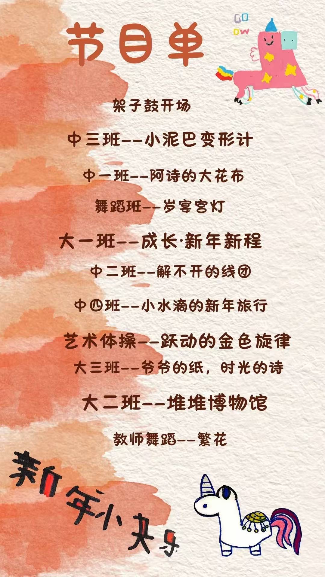中大班组节目单—:架子鼓开场、中三班--小泥巴变形计、中一班--阿诗的大花布、舞蹈班--岁宴宫灯、大一班成长。新年新程、中二班解不开的线团、中四班-小水滴的新年旅行、艺术体操跃动的金色旋律大三班--爷爷的纸,时光的诗、大二班--堆堆博物馆、教师舞蹈-繁花