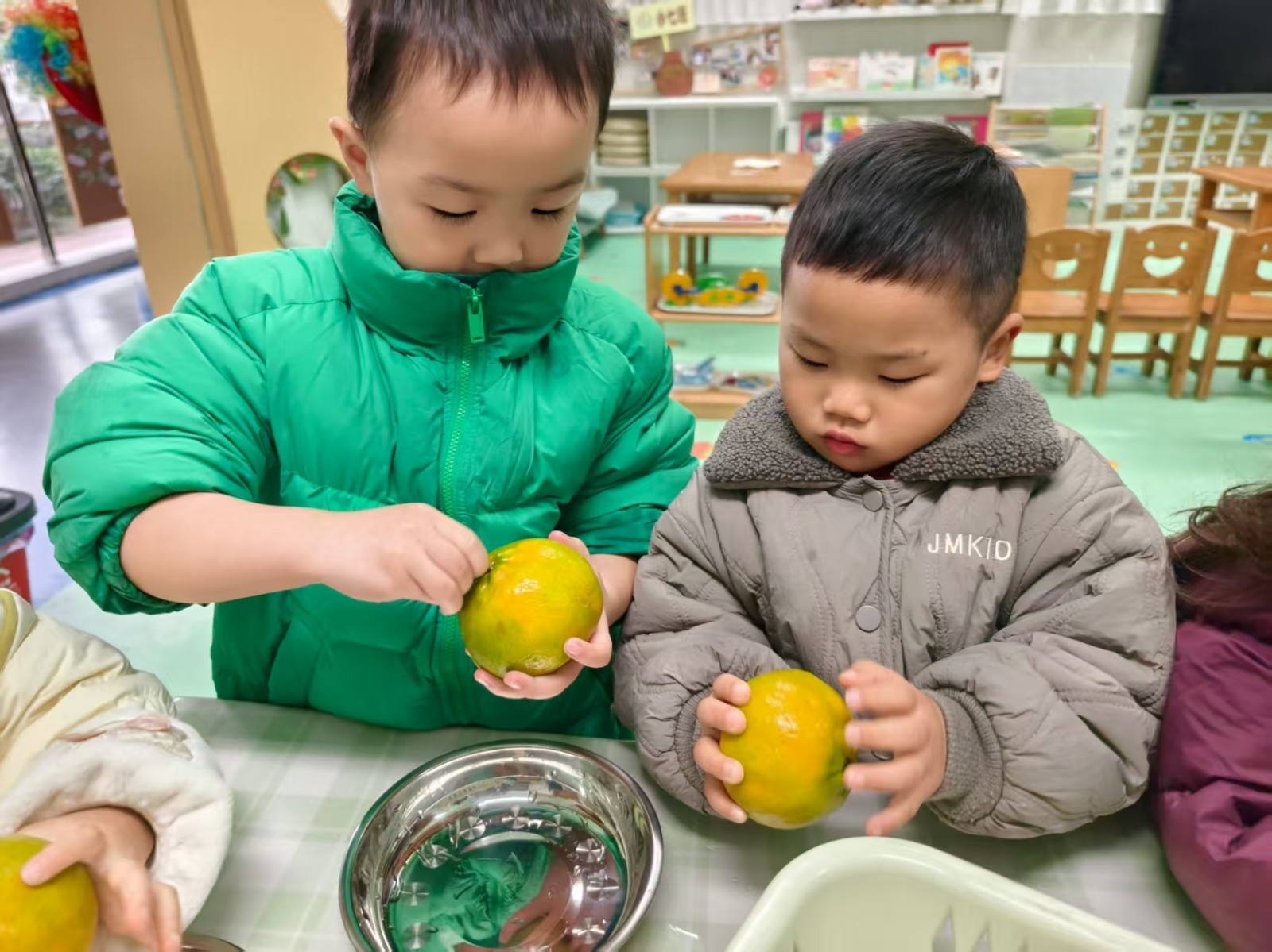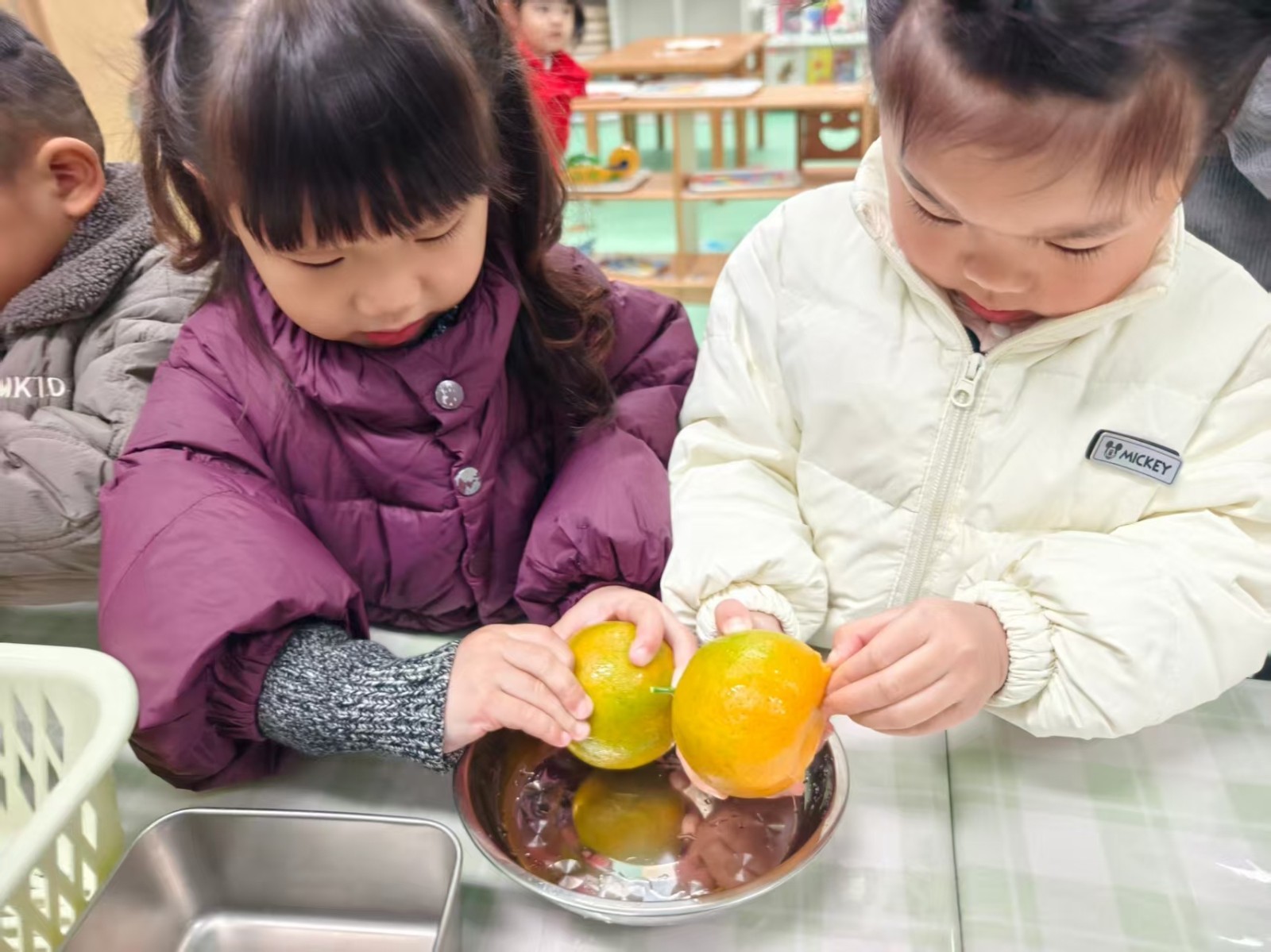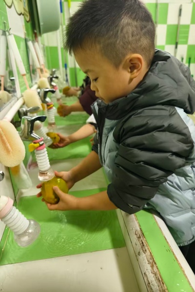 孩子们小手捧着橘子轻轻搓洗,