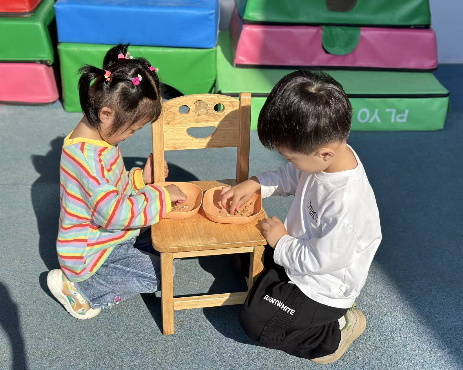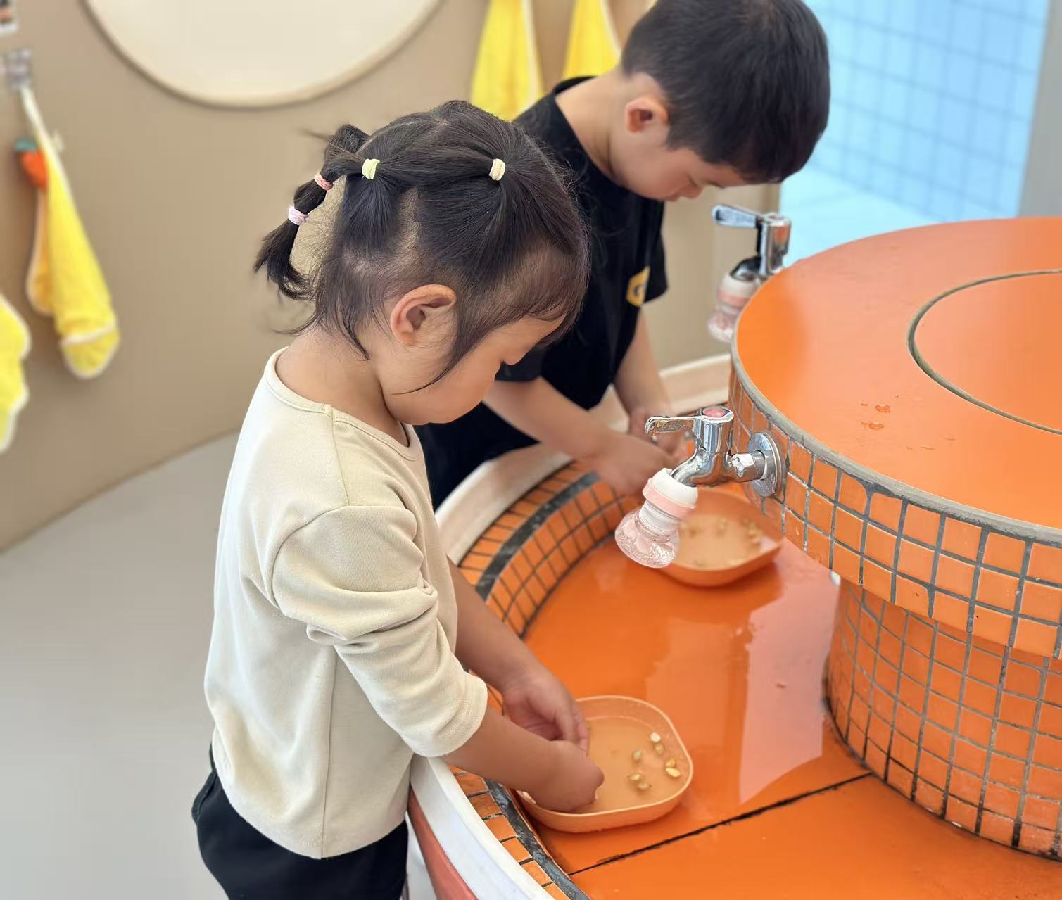 口袋里的秋天,藏着南瓜的秘密 至乐分园胡静 幼儿喜欢在大自然中发现、探索,一花一草、一树一木,都对孩子们有着巨大的吸引力。本学期,乐山高新区实验幼儿园至乐分园的孩子们对“南瓜”产生了浓厚的兴趣。他们与南瓜的相遇,充满了天马行空的想象与挑战。 金秋九月,一场关于“把秋天装进口袋里”的户外收集活动后,孩子们开展“口袋宝藏分享会”,佳钰带来的橙黄南瓜勾起大家对南瓜的兴趣。一周后,孩子们带来了圆滚滚、小巧、长条形、带绿纹等各式各样的南瓜,就此开启南瓜的探索之旅。 小小的南瓜,大大的好奇。宝贝们俯身拿起放大镜探索,和小伙伴一起深入南瓜的内部世界。摸摸圆圆的南瓜,看看黄黄的瓜纹,闻闻甜甜的瓜香,小小的我们,探索大大的南瓜世界~ 看着杂乱的分类现场,老师抛出问题:“除了按照南瓜的形状分类,还可以怎么分呢?”孩子们两两合作,自发地将南瓜按从大到小的顺序排成一排,像搭起了一座“南瓜塔”。孩子们通过亲手触摸、直观比对,清晰感知了“大”“小”的相对概念,学会了用简单语言描述南瓜的大小特征。 为丰富孩子们对南瓜的认知,教室里投放了绘本《胖墩墩的南瓜》,体验情景表演游戏《南瓜汤》,进一步激发幼儿对南瓜的兴趣,期待后续的南瓜探秘游戏。 这些可爱的小猜想,让宝贝们迫不及待地想打开南瓜,去一探究竟啦!在孩子们的期待中,我们开展“南瓜大解剖”活动。 孩子们轮流触摸、观察,证实了小旸的猜想——南瓜肉是金黄色的,摸起来软软糯糯;籽儿扁扁带尖,裹在黏糊糊的瓜瓤里。他们把发现画下来后,又对南瓜籽产生了计数兴趣。 通过分工合作,孩子们巩固了点数技能,还学会按照分类计数,并开始尝试用南瓜籽种植,开启了南瓜籽的种植实验。 孩子们挖瓜瓤遇黏液难题,柯瑞巧用勺子刮籽防粘手,思礼发现清水能溶解黏液让南瓜籽变干净,孩子们纷纷模仿,用清水搓洗后干净的南瓜籽就浮起来了。 孩子们种植南瓜籽时发现有的地方浇了很多水,有的地方没有浇到水。老师组织孩子们及时回顾,了解种子发芽的条件,约定做好标记、每周按时进行观察。 一周后南瓜籽未发芽甚至腐烂,孩子们分析出浇水不当、频繁挖土等原因,通过沉浮筛选出饱满籽儿并开展科学小实验。幼儿在操作中萌生大小认知、点数、筛种等探究点,也让数学技能在解决数籽、选籽等问题中灵活运用。 这段南瓜相伴的时光,如饱满种子埋在心底,让他们在自主探究中收获了真切的成长与温暖。