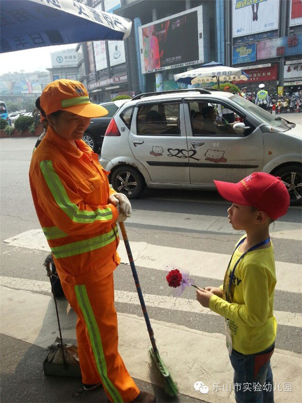 “阿姨,你们的上班时间是什么时候啊?你主要负责哪里的清洁卫生呢?”杨雨润小朋友正在采访环卫工人,还为环卫阿姨献上了鲜花,对她们辛勤劳动致以谢意,并祝阿姨五一节快乐。在班级分享会上,杨雨润小朋友分享了他的采访经历,一本正经的对其他小朋友说:“环卫阿姨打扫街道好辛苦啊,我们在出去玩的时候一定要把垃圾放进垃圾桶里才好。”