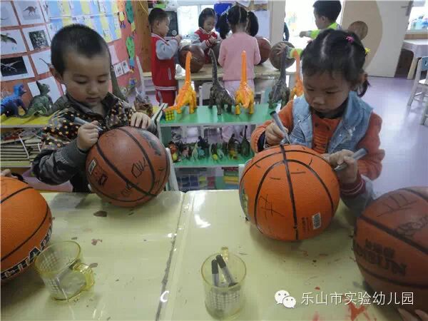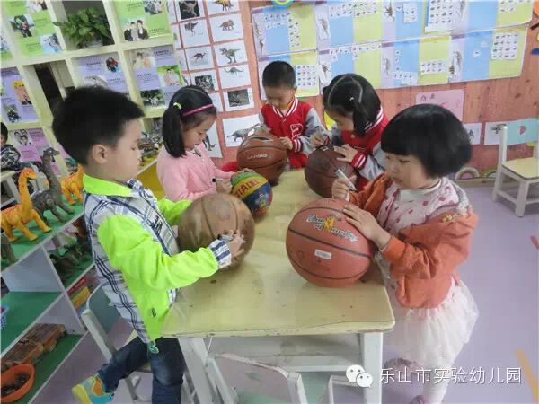 本学期一开学,市实幼中六班的家长们就为孩子们每人准备了一颗篮球,孩子们从简单的拍球练习开始,原地右手拍、左手拍,篮球在身体的各个部位绕行,再到投篮、运球走路、带球过障碍、带球跑步、两人抛接球等等,篮球成为了孩子们生活的一部分。利用闲暇时光,孩子们还给自己的心爱篮球进行了个性装饰。