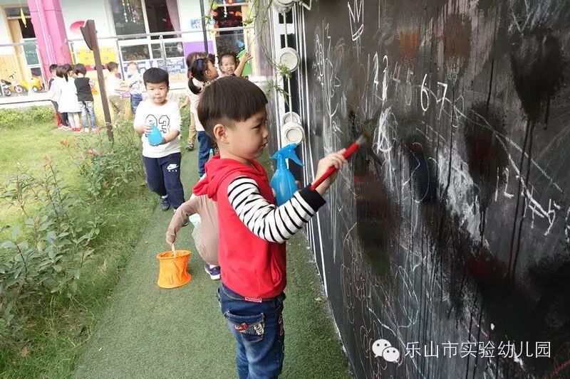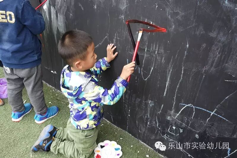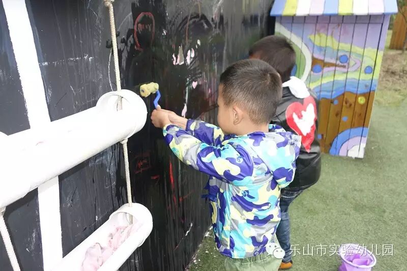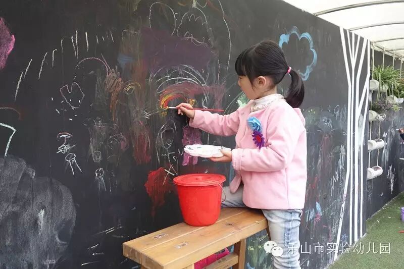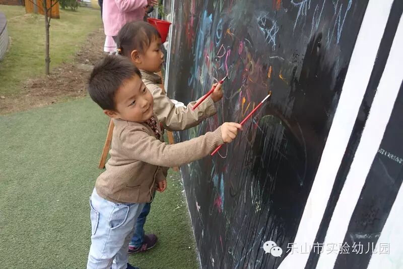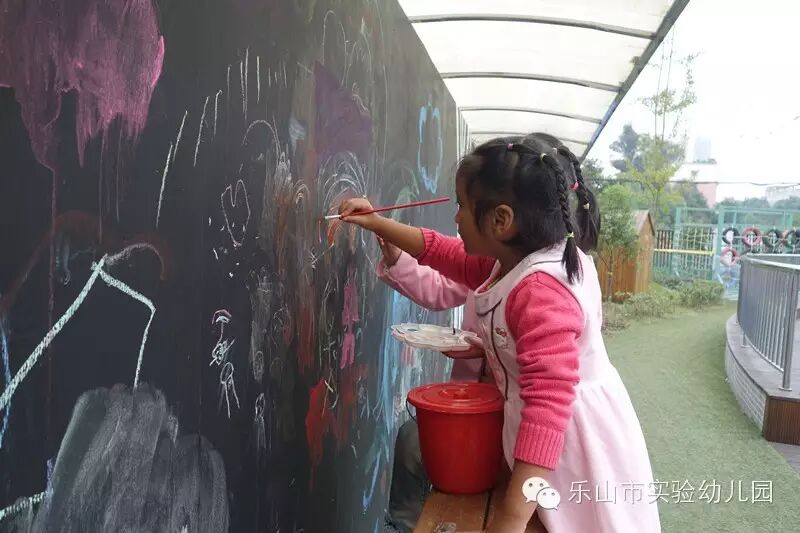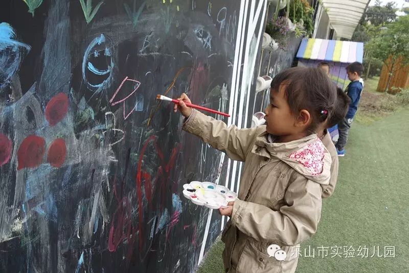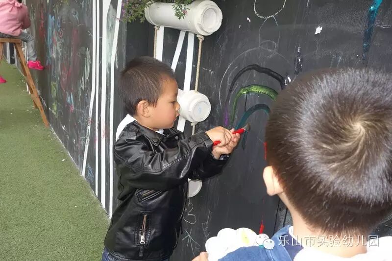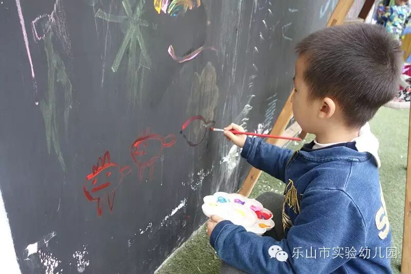 涂鸦,是幼儿心灵感受的自然流露,在孩子们的世界里,没有规规矩矩的线条,只有五彩缤纷的颜色,奇形怪状的图案。而兴趣的产生是孩子们进行美术创作的基石和动力源泉,是幼儿产生求知欲望的主要动力,也是他们进行积极学习的最好老师。在乐山市实验幼儿园的涂鸦区,为孩子们提供了足够的空间以及丰富的绘画材料,孩子们这片开放的空间大胆地探索、设计自己的计划,按自己的方式去尝试、表现、去体验、创造!更是天马行空、想象、创意、释放自己的童心!