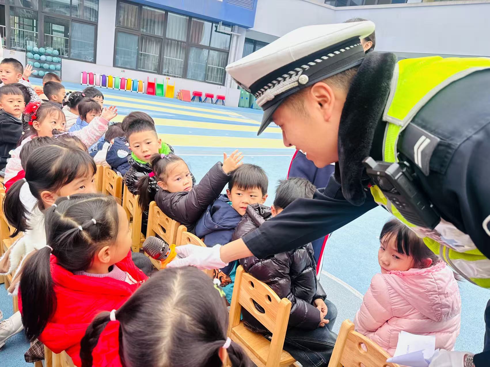 交警叔叔们通过问答互动、视频案例等形式,生动讲解“汽车盲区”和“一盔一带”的重要性,帮助孩子们在参与中牢记安全。