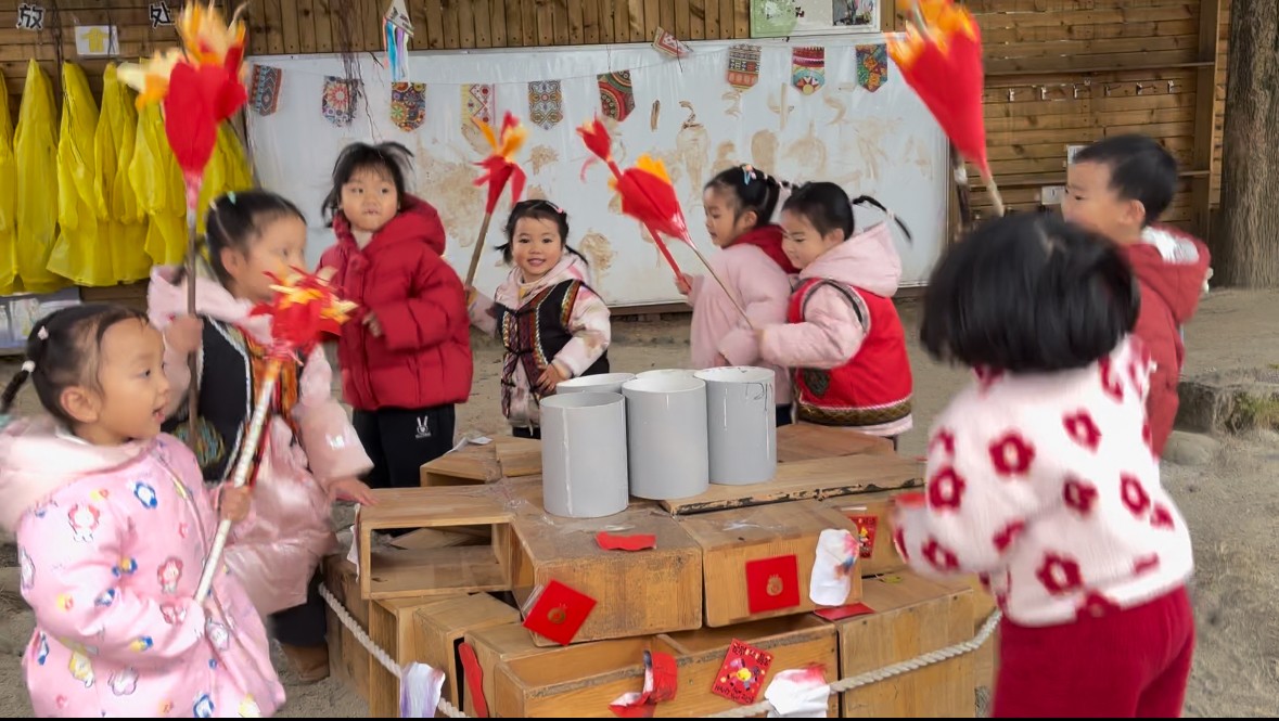 为了让节日氛围更浓厚,宝贝们将彝族银饰亮纹记忆与新年符号相融,亲手制作民族纹样挂饰、红灯笼和红包,悬挂于沙水区,与积木火把相映成趣。换上心仪服饰在自己打造的专属空间里尽情舞蹈、游戏,笑脸比灯火还要明亮。