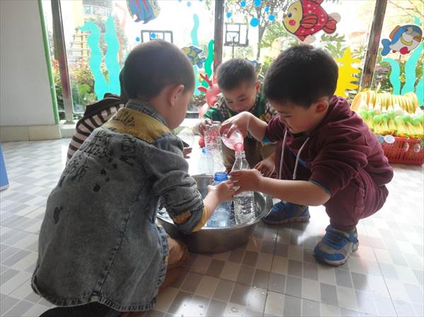 乐山市实验幼儿园在学习《3-6岁儿童学习与发展指南》基础上,本着生活即教育的现代教育理念,抓住幼儿的思维特点是以具体形象思维为主,积极开展形式多样、材料丰富的个别和分组活动。幼儿科学学习的核心是激发幼儿探究兴趣,体验探究过程,发展初步的探究能力。老师让幼儿参与收集粗细不一的瓶子,投放到科学探究活动中,让幼儿在用不同容器玩水的实际情境中动手动脑,获得直接的感性经验。让幼儿通过直接感知、亲身体验和实际操作,积累有关量的经验,初步了解容量多少和容器大小的关系,建立初步的等量观念。